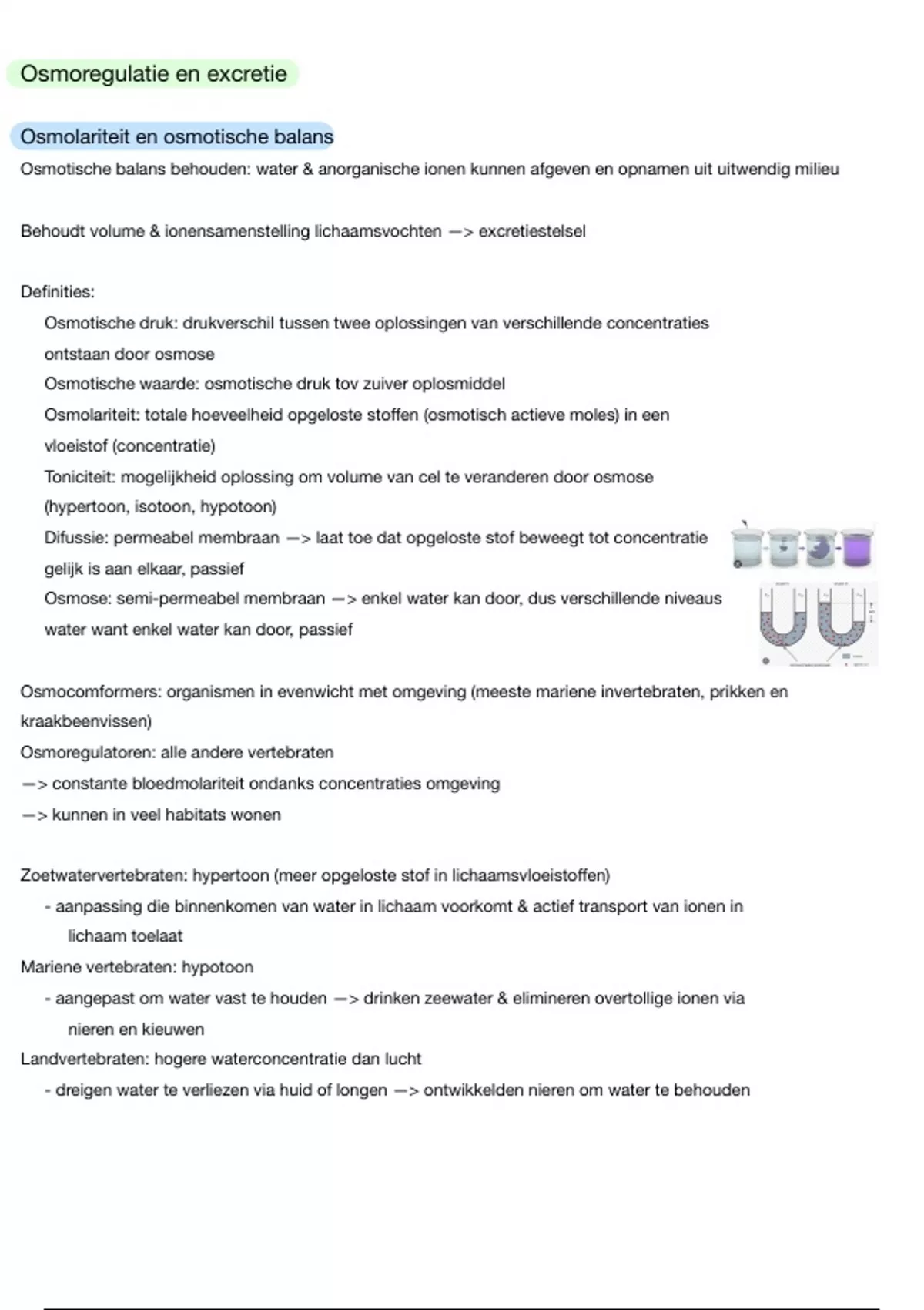 Osmose: semi-permeabel membraan —> enkel water kan door, dus verschillende niveaus