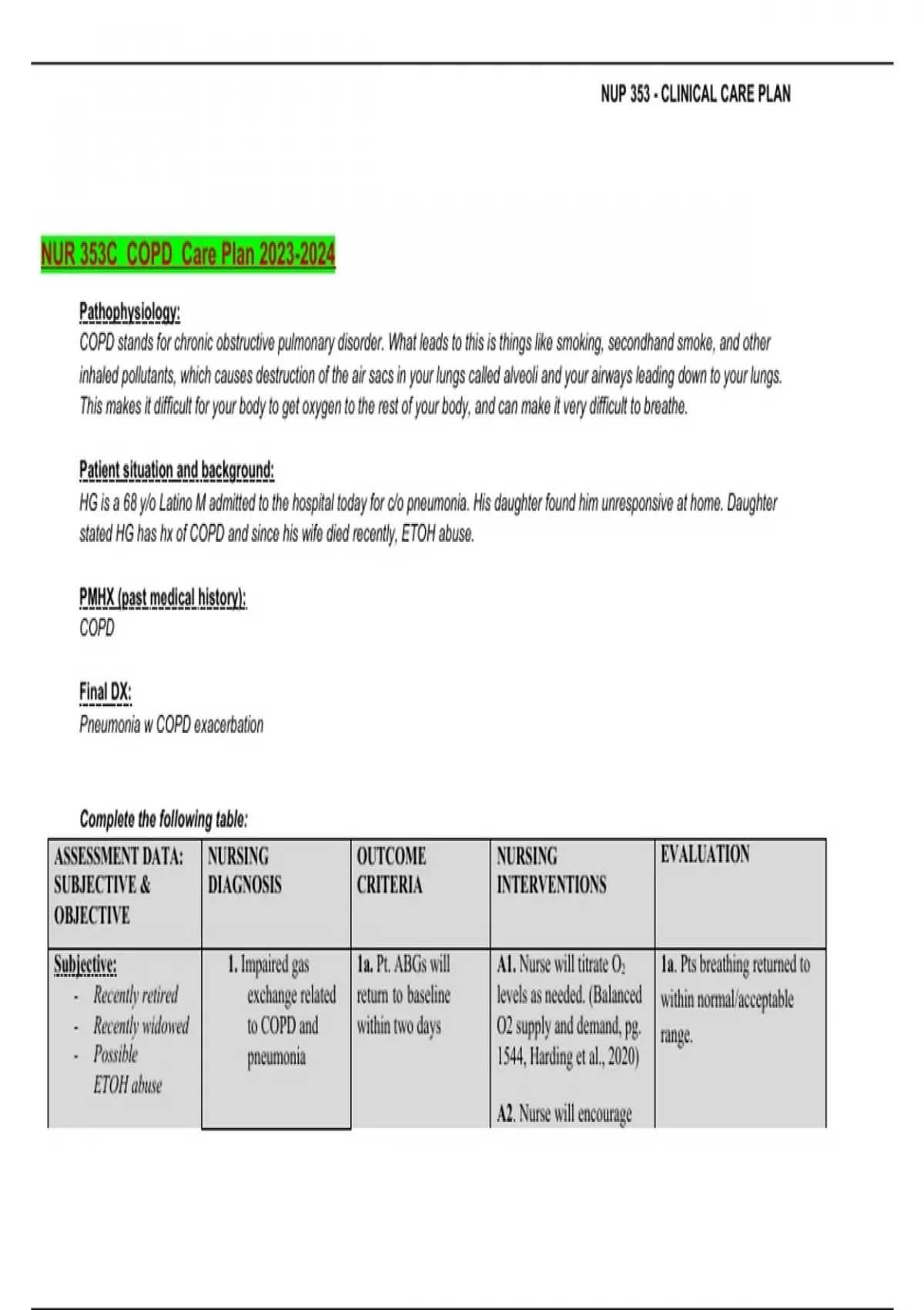 NUR 353C COPD Care Plan 2023-2024