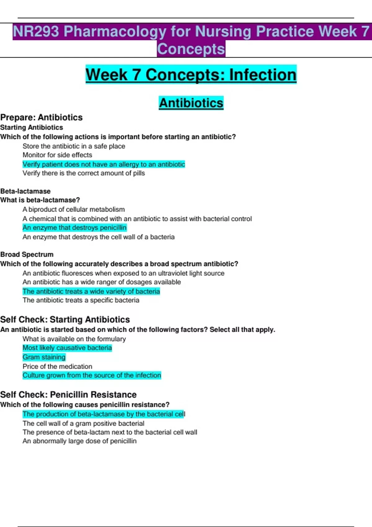 NR293 Pharmacology for Nursing Practice Week 7 Concepts -INFECTION-WITH ALL ANSWERS ACTUAL AND PASSED BY EXPERT TUTORS NR293 Pharmacology for Nursing Practice Week 7 Concepts -INFECTION-WITH ALL ANSWERS ACTUAL AND PASSED BY EXPERT TUTORS NR293 Pharmacol