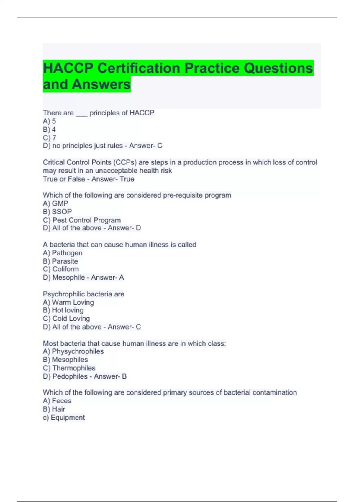 HACCP Certification Practice Questions and Answers