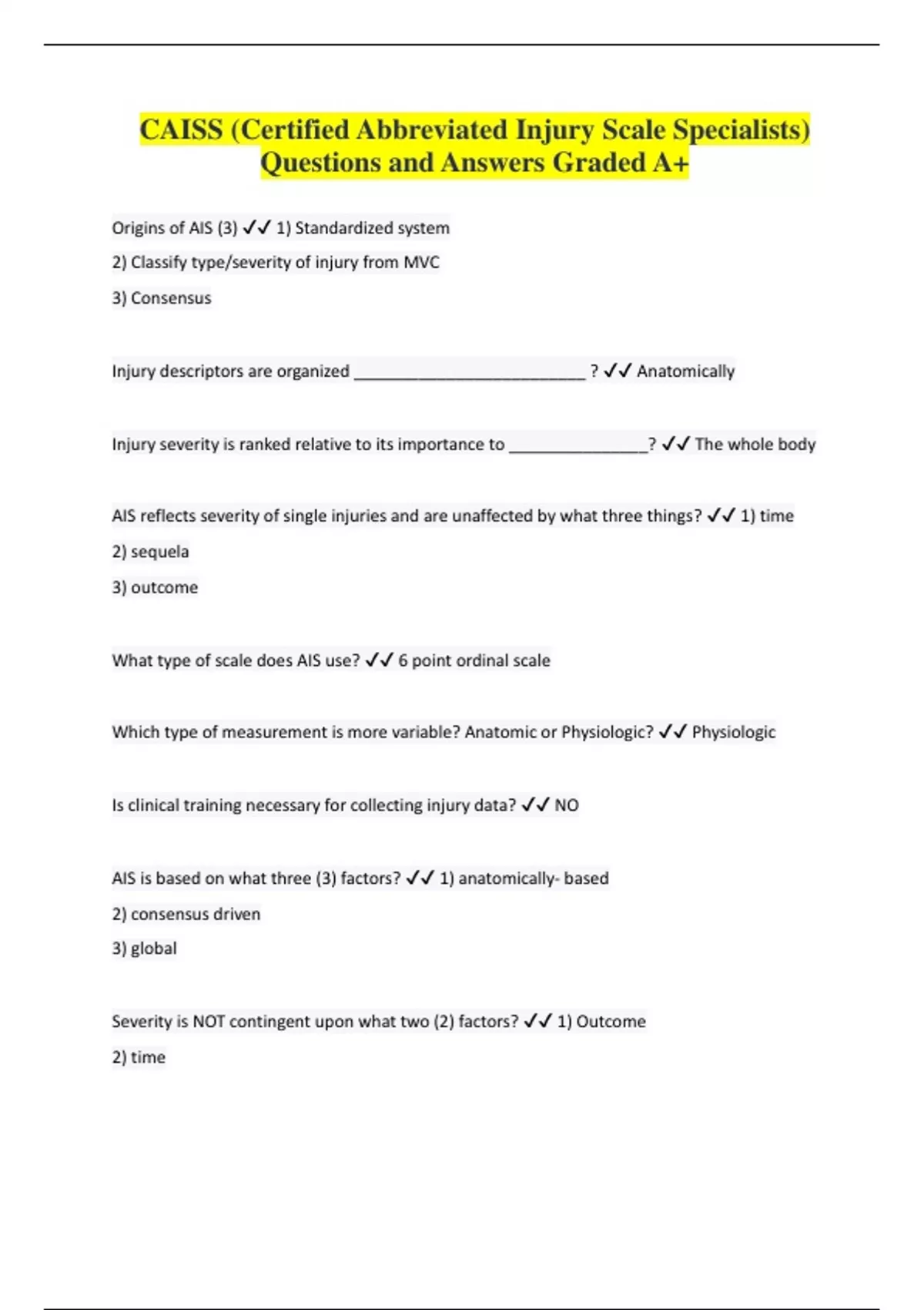CAISS question with complete solution 2023Origins of AIS (3) - correct answer 1) Standardized system 2) Classify type/severity of injury from MVC 3) Consensus Injury descriptors are organized _________________________ ? - correct answer Anatomically Injury severity is ranked relative to its importance to _______________? - correct answer The whole body AIS reflects severity of single injuries and are unaffected by what three things? - correct answer 1) time 2) sequela 3) outcome What type of scale does AIS use? - correct answer 6 point ordinal scale Which type of measurement is more variable? Anatomic or Physiologic? - correct answer Physiologic Is clinical training necessary for collecting injury data? - correct answer NO AIS is based on what three (3) factors? - correct answer 1) anatomically- based 2) consensus driven 3) global Severity is NOT contingent upon what two (2) factors? - correct answer 1) Outcome 2) time Numerical ranking of severity: 1 - correct answer minor Numerical ranking of severity: 2 - correct answer moderate Numerical ranking of severity: 3 - correct answer serious Numerical ranking of severity: 4 - correct answer severe Numerical ranking of severity: 5 - correct answer critical Numerical ranking of severity: 6 - correct answer maximum (currently untreatable) Is mortality a sole determinant of AIS severity? - correct answer NO Are all AIS data comparable from year to year? - correct answer NO (updates) Is