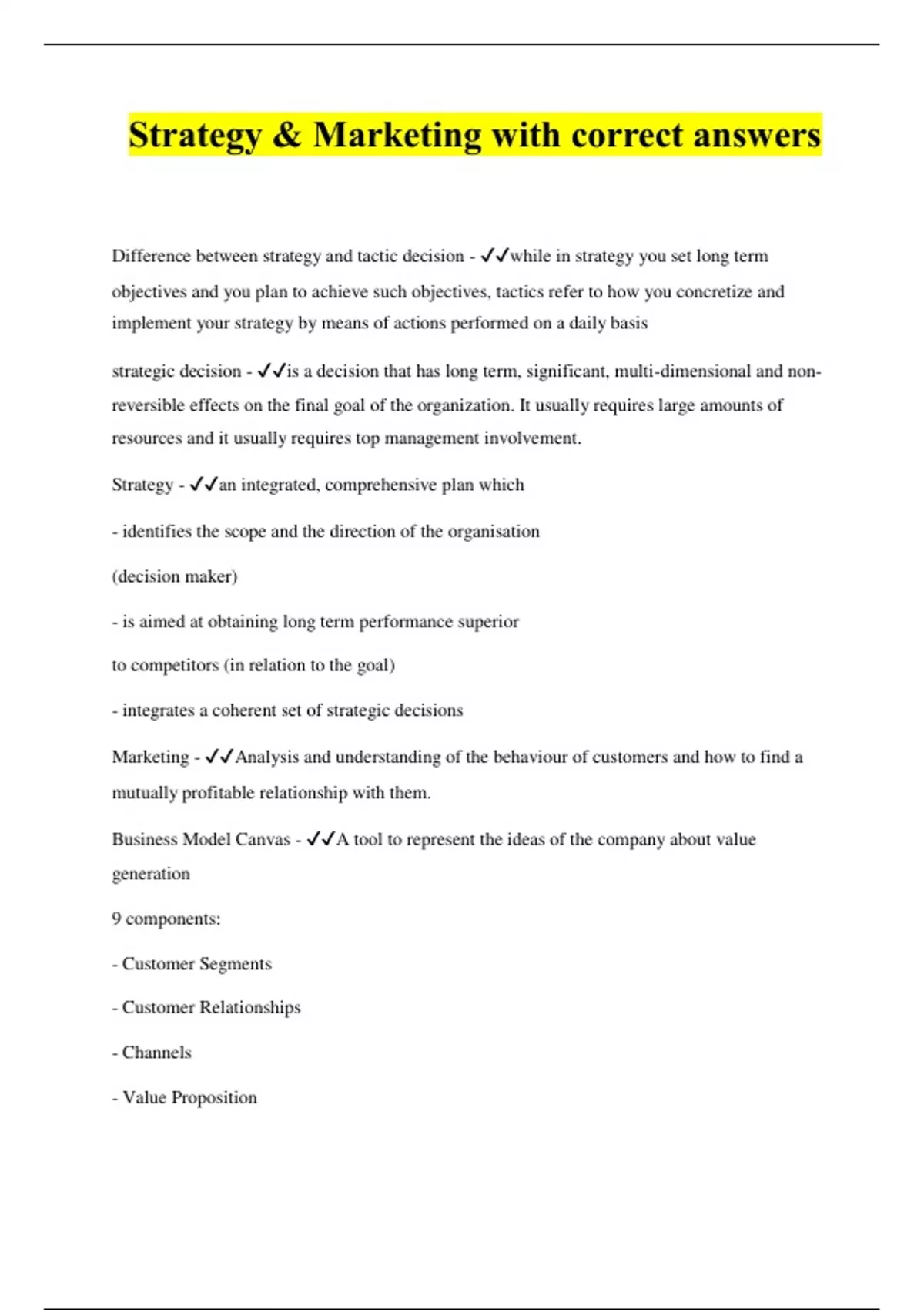 Difference between strategy and tactic decision - while in strategy you set long term objectives and you plan to achieve such objectives, tactics refer to how you concretize and implement your strategy by means of actions performed on a daily basis strategic decision - is a decision that has long term, significant, multi-dimensional and nonreversible effects on the final goal of the organization. It usually requires large amounts of resources and it usually requires top management involvement. Strategy - an integrated, comprehensive plan which - identifies the scope and the direction of the organisation (decision maker) - is aimed at obtaining long term performance superior to competitors (in relation to the goal) - integrates a coherent set of strategic decisions Marketing - Analysis and understanding of the behaviour of customers and how to find a mutually profitable relationship with them. Business Model Canvas - A tool to represent the ideas of the company about value generation 9 components: - Customer Segments - Customer Relationships - Channels - Value Proposition - Key Activities - Key Resources - Key Partners - Cost Structure - Revenue Streams BMC - Customer Segments - The groups of customers with distinct characteristics