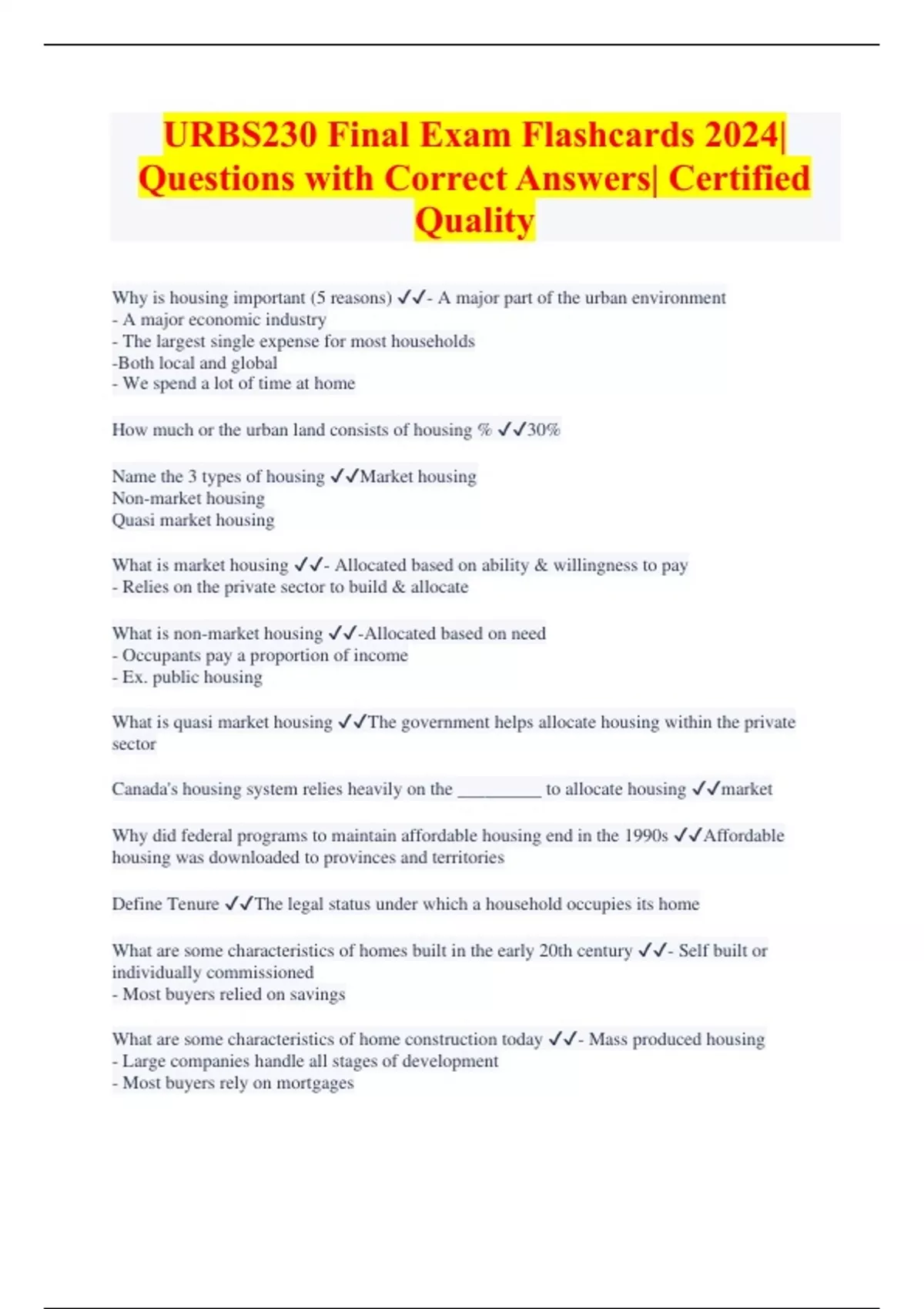 URBS230 Final Exam Flashcards 2024| Questions with Correct Answers| Certified Quality Why is housing important (5 reasons) - A major part of the urban environment - A major economic industry - The largest single expense for most households -Both local and global - We spend a lot of time at home How much or the urban land consists of housing % 30% Name the 3 types of housing Market housing Non-market housing Quasi market housing What is market housing - Allocated based on ability & willingness to pay - Relies on the private sector to build & allocate What is non-market housing -Allocated based on need - Occupants pay a proportion of income - Ex. public housing What is quasi market housing The government helps allocate housing within the private sector Canada's housing system relies heavily on the _________ to allocate housing market Why did federal programs to maintain affordable housing end in the 1990s Affordable housing was downloaded to provinces and territories Define Tenure The legal status under which a household occupies its home What are some characteristics of homes built in the early 20th century - Self built or individually commissioned - Most buyers relied on savings