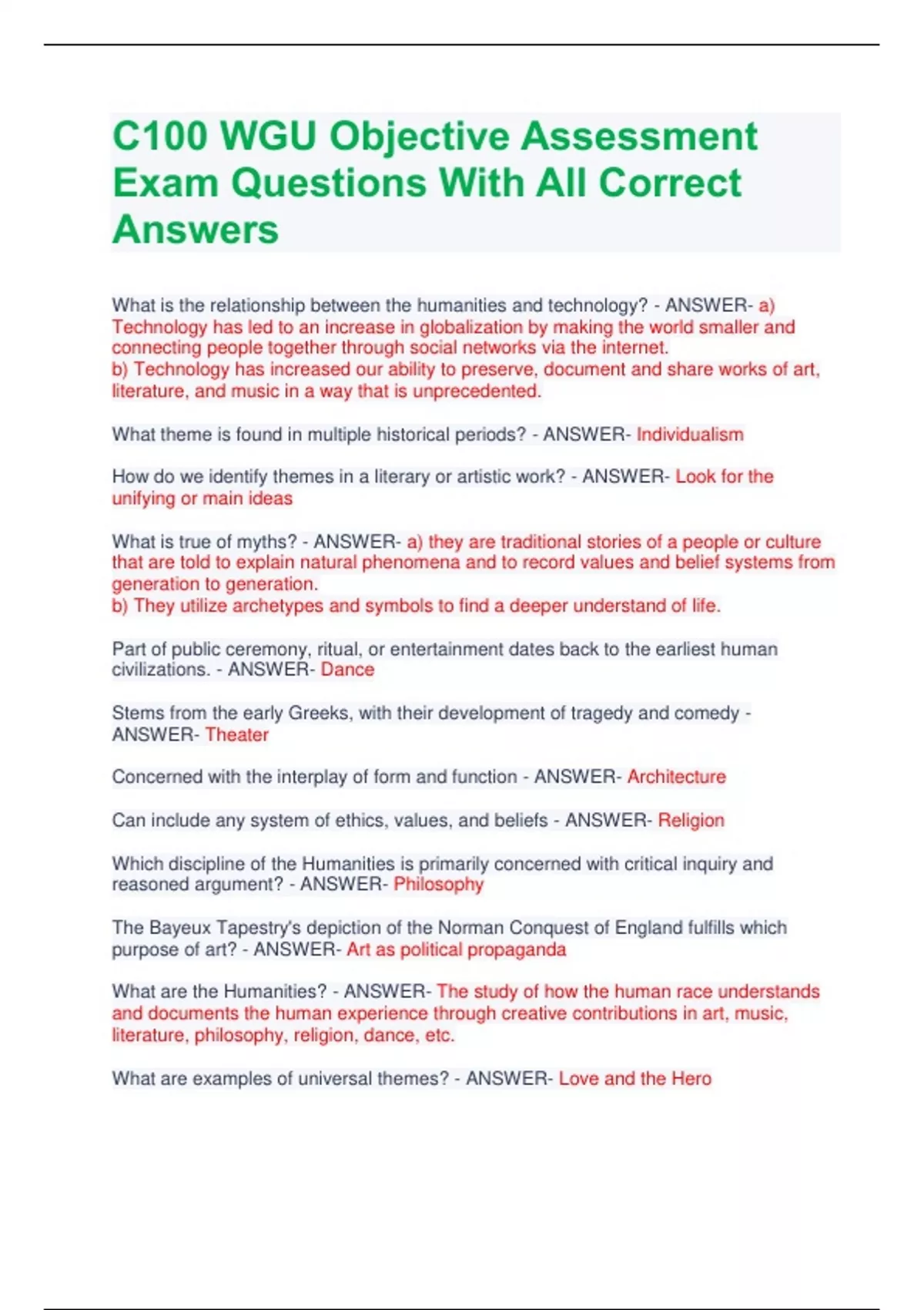 C100 WGU Objective Assessment Exam Questions With All Correct Answers What is the relationship between the humanities and technology? - ANSWER- a) Technology has led to an increase in globalization by making the world smaller and connecting people together through social networks via the internet. b) Technology has increased our ability to preserve, document and share works of art, literature, and music in a way that is unprecedented. What theme is found in multiple historical periods? - ANSWER- Individualism How do we identify themes in a literary or artistic work? - ANSWER- Look for the unifying or main ideas What is true of myths? - ANSWER- a) they are traditional stories of a people or culture that are told to explain natural phenomena and to record values and belief systems from generation to generation. b) They utilize archetypes and symbols to find a deeper understand of life. Part of public ceremony, ritual, or entertainment dates back to the earliest human civilizations. - ANSWER- Dance Stems from the early Greeks, with their development of tragedy and comedy - ANSWER- Theater Concerned with the interplay of form and function - ANSWER- Architecture Can include any system of ethics, values, and beliefs - ANSWER- Religion Which discipline of the Humanities is primarily concerned with critical inquiry and reasoned argument? - ANSWER- Philosophy The Bayeux Tapestry's depiction of the Norman Conquest of England fulfills which purpose of art? - ANSWER- Art as political propaganda What are the Humanities? - ANSWER- The study of how the human race understands and documents the human experience through creative contributions in art, music, literature, philosophy, religion, dance, etc. What are examples of universal themes? - ANSWER- Love and the Hero Brotherly or selfless love - ANSWER- Agape A recurrent example or model of human behavior - ANSWER- Archetypes An experience of beauty that is its own justification - ANSWER- Aesthetic Passionate or sexual love - ANSWER- Eros A myth that is embraced by a majority of people throughout history - ANSWERMonomyth Why is E.O. Wilson's theory of consilience important to the study of the Humanities? - ANSWER- It reinforces interdisciplinary study and facilitates the exchange of information necessary to create a more holistic understanding of who we are. How was Humanism reflected in the non-western world? - ANSWER- Ancient Chinese culture embraced principles in Confucianism and Buddhism that mirrored Humanist principles. How does studying the Humanities increase cross-cultural communication? - ANSWERIt helps us to interact with and understand a variety of people from different times and different places through their creative contributions. How does studying the portrayal of love over time enhance one's understanding of humanity? - ANSWER- The study of love in all its form (eros, agape, and platonic love) illustrates a distinction in types of love that has captured the attention of artists. What is the difference between a myth and a monomyth? - ANSWER- Myths can include a wide variety of narratives and archetypes. The monomyth focuses on the hero's journey. Emphasized the themes of order and balance in its construction as a temple to the goddess Athena, patron of Athens - ANSWER- the Parthenon Applied reason and logical thought to ideas about government and how to live a good balanced life - ANSWER- the Republic An epic poem narrating the story of an ideal Greek hero who combined all the greatest virtues of Greek culture, as well as showing his interaction with the Greek pantheon of gods - ANSWER- the Odyssey A story of a man who lives his life not knowing the truth of his parentage and whose pride ultimately causes him to ignore his flawed humanity, resulting in the ultimate punishment of blindness and exile. - ANSWER- Oedipus Rex A play about heroic women who withhold sex from their husbands in order to end the Peloponnesian war and force a more democratic, egalitarian political climate - ANSWER- Lysistrata Sappho's lyric poem "A Lament for Adonis" represents what major theme of the Classical Period? - ANSWER- The theme of humanism because it emphasizes human passions and emotions rather than idealized gods. Why is the statue The Metropolitan Kouros a notable example of Greek sculpture? - ANSWER- It utilized vertical and horizontal symmetry in creating the human form. Which of the following is an innovation during the Classical Period that was based on balance and reason? - ANSWER- The development of Western philosophy and the ideas that underlie the modern scientific method. What is the primary difference between Greek and Roman societies? - ANSWER- The Greeks lived in democratically-run city-states while the Romans had a larger centralized republic and eventually empire. How do the visual art and architecture of Greece and Rome differ? - ANSWER- a) Much of the sculpture in Greece was focused on honoring deities and elevating the human form while Rome used art predominantly to glorify the Roman Empire. b) The Greeks relied on post-and-lintel construction, and the Romans developed the use of columns and arches to design larger buildings. What reflects the theme of humanism in the Classical Period? - ANSWER- a) Greek philosophers questioned the truth of ancient religious myths in which gods acted unjustly. b) Aristotle investigated qualities that led to human excellence and made for a good life. What cultural exchange took place during the Classical Period? - ANSWER- The Gree