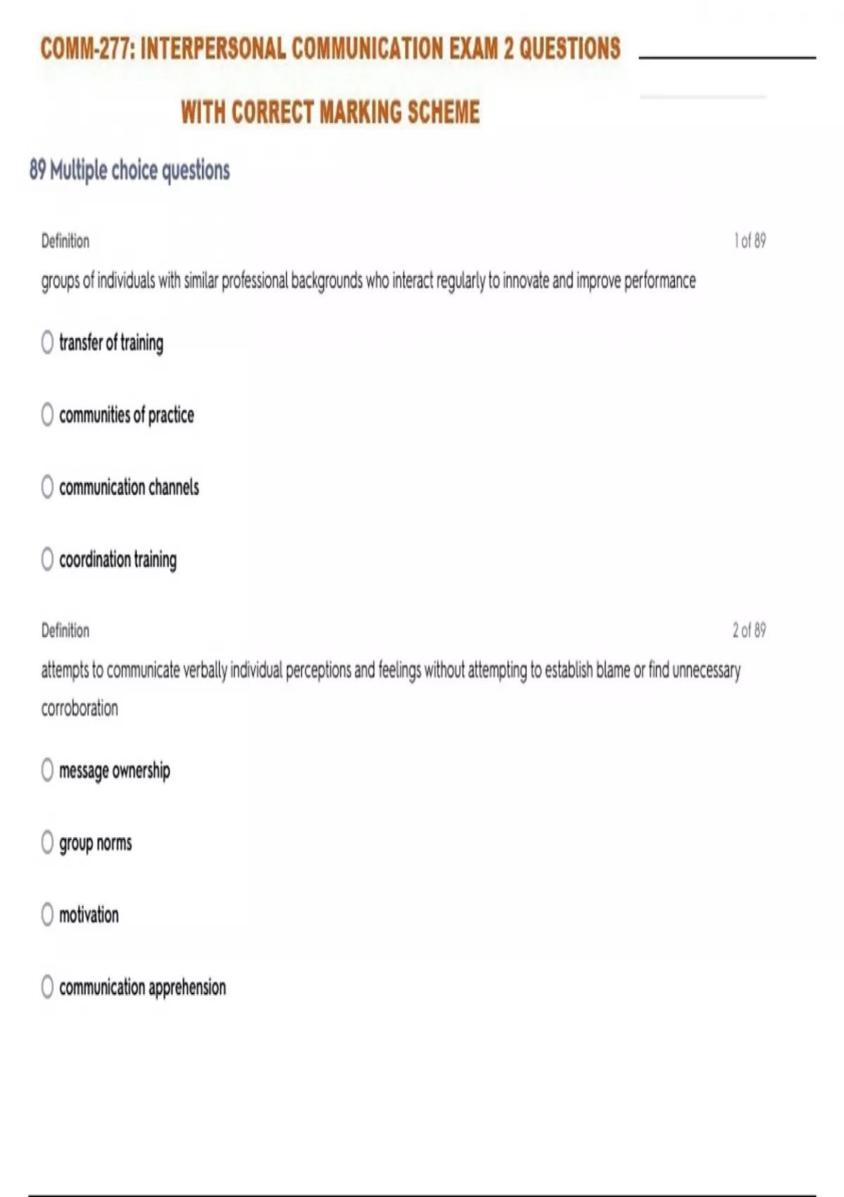 INTERPERSONAL COMMUNICATION COMM-277 EXAM 2 QUESTIONS WITH CORRECT MARKING SCHEME