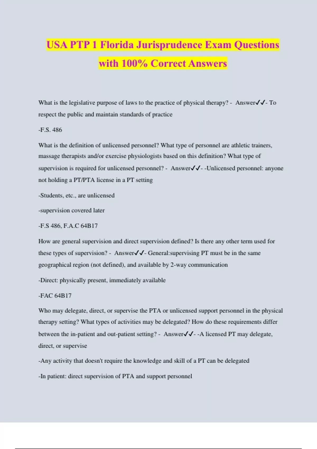 USA PTP 1 Florida Jurisprudence Exam Questions with 100% Correct Answers What is the legislative purpose of laws to the practice of physical therapy? - Answer️️ - To respect the public and maintain standards of practice -F.S. 486 What is the definition of unlicensed personnel? What type of personnel are athletic trainers, massage therapists and/or exercise physiologists based on this definition? What type of supervision is required for unlicensed personnel? - Answer️️ - -Unlicensed personnel: anyone not holding a PT/PTA license in a PT setting -Students, etc., are unlicensed -supervision covered later -F.S 486, F.A.C 64B17 How are general supervision and direct supervision defined? Is there any other term used for these types of supervision? - Answer️️ - General:supervising PT must be in the same geographical region (not defined), and available by 2-way communication -Direct: physically present, immediately available -FAC 64B17 Who may delegate, direct, or supervise the PTA or unlicensed support personnel in the physical therapy setting? What types of activities may be delegated? How do these requirements differ between the in-patient and out-patient setting? - Answer️️ - -A licensed PT may delegate, direct, or supervise -Any activity that doesn't require the knowledge and skill of a PT can be delegated -In patient: direct supervision of PTA and support personnel