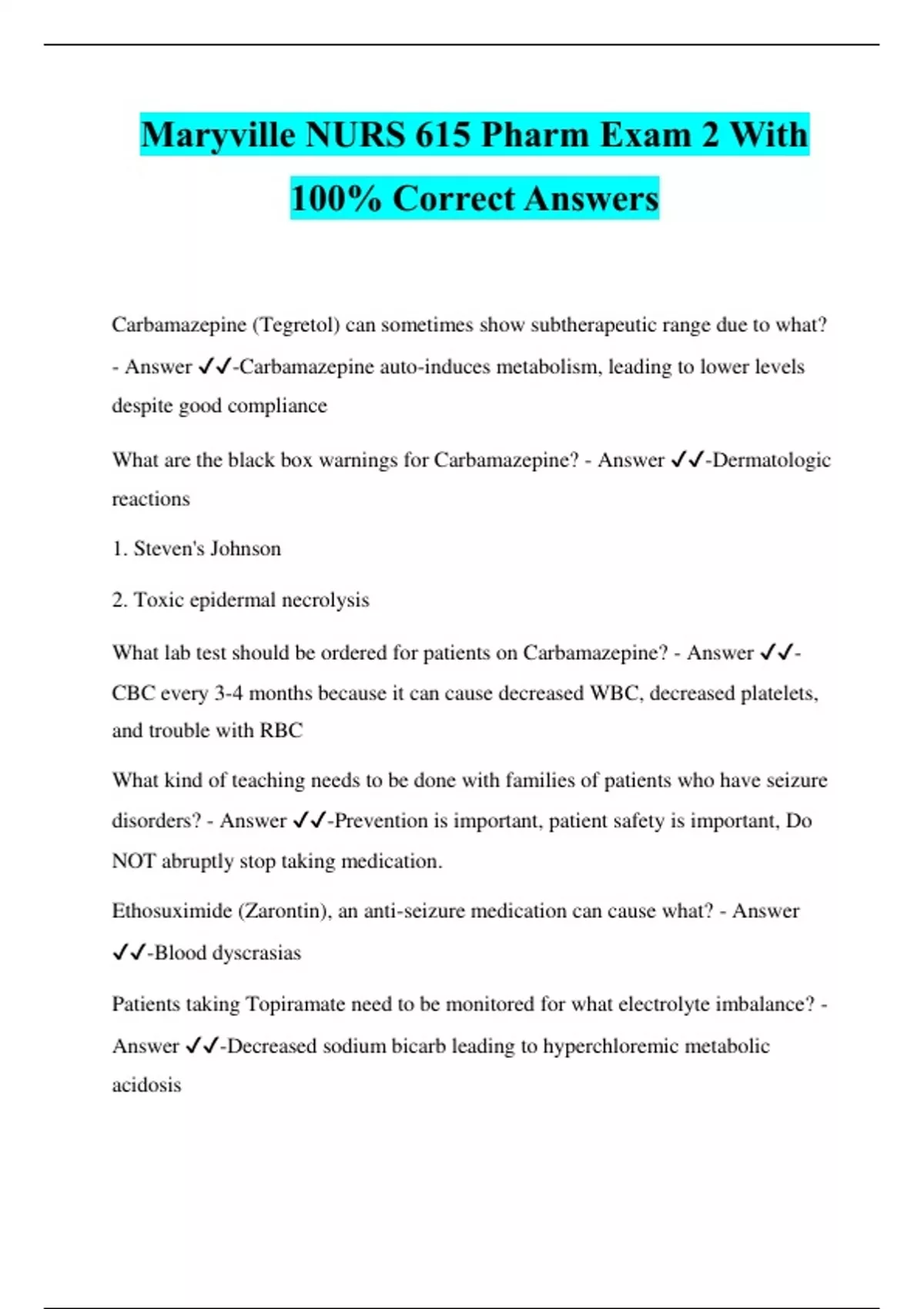 Maryville NURS 615 Pharm Exam 2 With 100% Correct Answers Carbamazepine (Tegretol) can sometimes show subtherapeutic range due to what? - Answer ️️ -Carbamazepine auto-induces metabolism, leading to lower levels despite good compliance What are the black box warnings for Carbamazepine? - Answer ️️ -Dermatologic reactions 1. Steven's Johnson 2. Toxic epidermal necrolysis What lab test should be ordered for patients on Carbamazepine? - Answer ️️ - CBC every 3-4 months because it can cause decreased WBC, decreased platelets, and trouble with RBC What kind of teaching needs to be done with families of patients who have seizure disorders? - Answer ️️ -Prevention is important, patient safety is important, Do NOT abruptly stop taking medication. Ethosuximide (Zarontin), an anti-seizure medication can cause what? - Answer ️️ -Blood dyscrasias Patients taking Topiramate need to be monitored for what electrolyte imbalance? - Answer ️️ -Decreased sodium bicarb leading to hyperchloremic metabolic acidosis