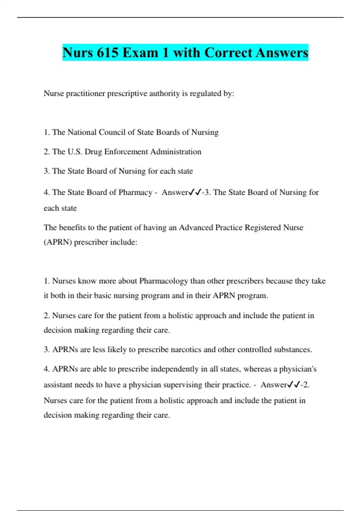 Nurs 615 Exam 1 with Correct Answers Nurse practitioner prescriptive authority is regulated by: 1. The National Council of State Boards of Nursing 2. The U.S. Drug Enforcement Administration 3. The State Board of Nursing for each state 4. The State Board of Pharmacy - Answer️️ -3. The State Board of Nursing for each state The benefits to the patient of having an Advanced Practice Registered Nurse (APRN) prescriber include: 1. Nurses know more about Pharmacology than other prescribers because they take it both in their basic nursing program and in their APRN program. 2. Nurses care for the patient from a holistic approach and include the patient in decision making regarding their care. 3. APRNs are less likely to prescribe narcotics and other controlled substances. 4. APRNs are able to prescribe independently in all states, whereas a physician's assistant needs to have a physician supervising their practice. - Answer️️ -2. Nurses care for the patient from a holistic approach and include the patient in decision making regarding their care. Clinical judgment in prescribing includes: 1. Factoring in the cost to the patient of the medication prescribed 2. Always prescribing the newest medication available for the disease process 3. Handing out drug samples to poor patients 4. Prescribing all generic medications to cut costs - Answer️️ -1. Factoring in the cost to the patient of the medication prescribed Criteria for choosing an effective drug for a disorder include: 1. Asking the patient what drug they think would work best for them 2. Consulting nationally recognized guidelines for disease management 3. Prescribing medications that are available as samples before writing a prescription 4. Following U.S. Drug Enforcement Administration guidelines for prescribing - Answer️️ -2. Consulting nationally recognized guidelines for disease management Nurse practitioner practice may thrive under health-care reform because of: 1. The demonstrated ability of nurse practitioners to control costs and improve patient outcomes 2. The fact that nurse practitioners will be able to practice independently 3. The fact that nurse practitioners will have full reimbursement under health-care reform 4. The ability to shift accountability for Medicaid to the state level - Answer️️ -1. The demonstrated ability of nurse practitioners to control costs and improve patient outcomes A patient's nutritional intake and laboratory results reflect hypoalbuminemia. This is critical to prescribing because: 1. Distribution of drugs to target tissue may be affected. 2. The solubility of the drug will not match the site of absorption. 3. There will be less free drug available to generate an effect. 4. Drugs bound to albumin are readily excreted by the kidneys. - Answer️️ -1. Distribution of drugs to target tissue may be affected. Drugs that have a significant first-pass effect: 1. Must be given by the enteral (oral) route only 2. Bypass the hepatic circulation 3. Are rapidly metabolized by the liver and may have little if any desired action 4. Are converted by the liver to more active and fat-soluble forms - Answer️️ -3. Are rapidly metabolized by the liver and may have little if any desired action The route of excretion of a volatile drug will likely b