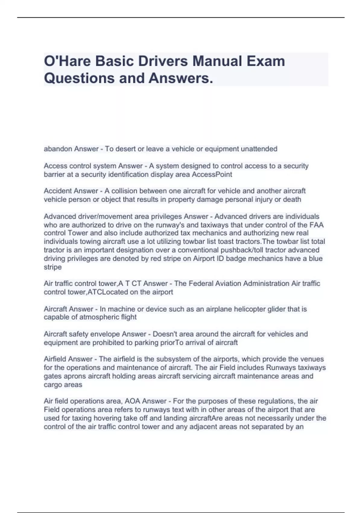 O'Hare Basic Drivers Manual Exam Questions and Answers.
