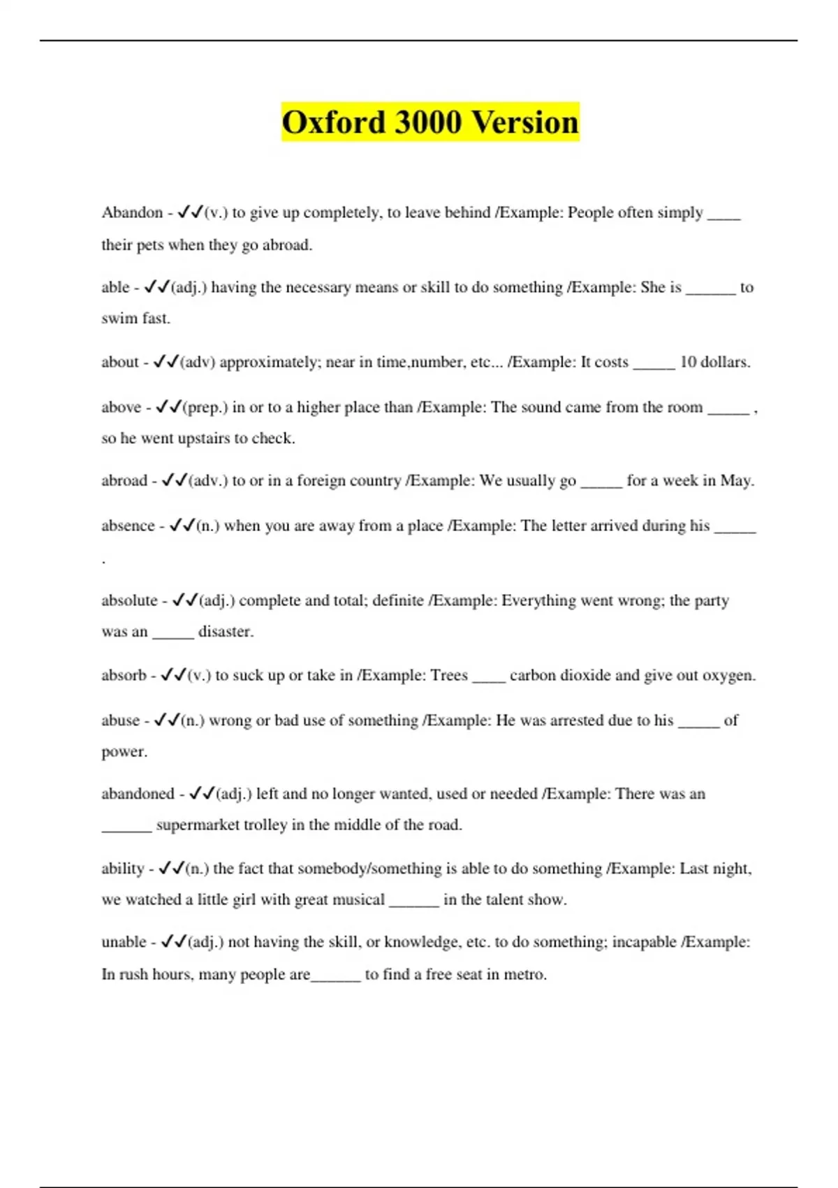 Abandon - (v.) to give up completely, to leave behind /Example: People often simply ____ their pets when they go abroad. able - (adj.) having the necessary means or skill to do something /Example: She is ______ to swim fast. about - (adv) approximately; near in time,number, etc... /Example: It costs _____ 10 dollars. above - (prep.) in or to a higher place than /Example: The sound came from the room _____ , so he went upstairs to check. abroad - (adv.) to or in a foreign country /Example: We usually go _____ for a week in May. absence - (n.) when you are away from a place /Example: The letter arrived during his _____ . absolute - (adj.) complete and total; definite /Example: Everything went wrong; the party was an _____ disaster. absorb - (v.) to suck up or take in /Example: Trees ____ carbon dioxide and give out oxygen. abuse - (n.) wrong or bad use of something /Example: He was arrested due to his _____ of power. abandoned - (adj.) left and no longer wanted, used or needed /Example: There was an ______ supermarket trolley in the middle of the road. ability - (n.) the fact that somebody/something is able to do something /Example: Last night, we watched a little girl with great musical ______ in the talent show. unable - (adj.) not having the skill, or knowledge, etc. to do something; incapable /Example: In rush hours, many people are______ to find a free seat in metro. absent - (adj.) not in a place; away /Example: Love was totally ______ from his childhood. absolutely - (adv.) completely or totally /Example: You're ______ right.