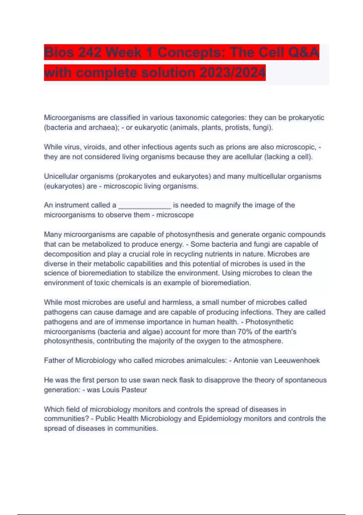 Bios 242 Week 1 Concepts: The Cell Q&A with complete solution 2023/2024