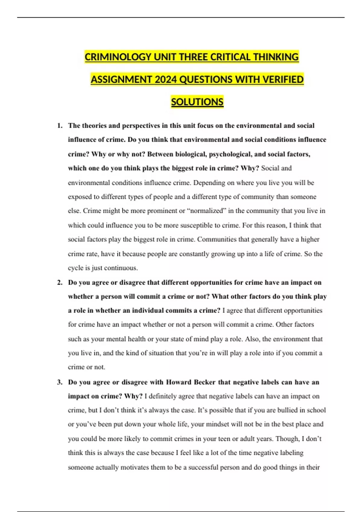 CRIMINOLOGY UNIT THREE CRITICAL THINKING ASSIGNMENT 2024 LATEST QUESTIONS WITH VERIFIED SOLUTIONS