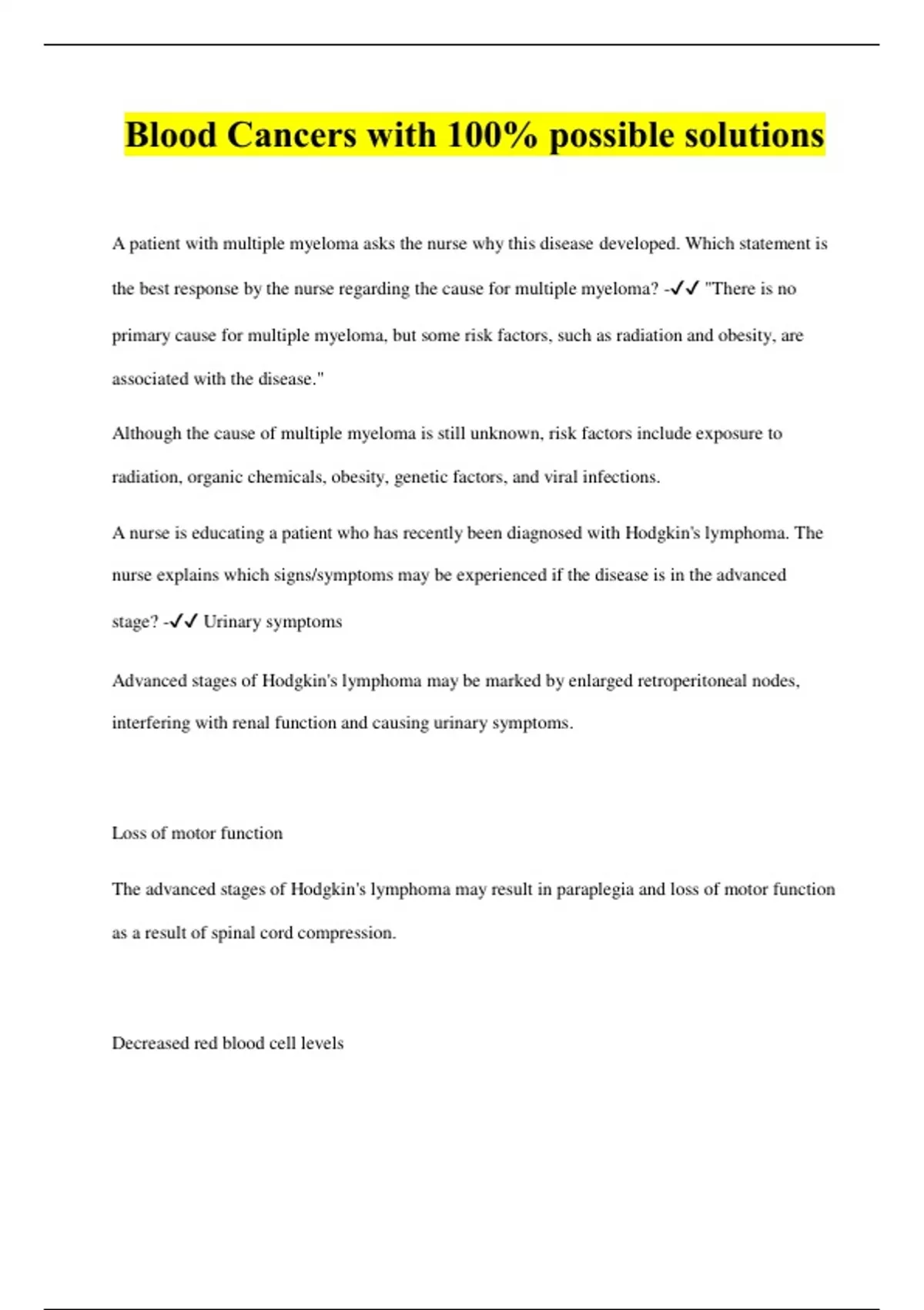 A patient with multiple myeloma asks the nurse why this disease developed. Which statement is the best response by the nurse regarding the cause for multiple myeloma? - "There is no primary cause for multiple myeloma, but some risk factors, such as radiation and obesity, are associated with the disease." Although the cause of multiple myeloma is still unknown, risk factors include exposure to radiation, organic chemicals, obesity, genetic factors, and viral infections. A nurse is educating a patient who has recently been diagnosed with Hodgkin's lymphoma. The nurse explains which signs/symptoms may be experienced if the disease is in the advanced stage? - Urinary symptoms Advanced stages of Hodgkin's lymphoma may be marked by enlarged retroperitoneal nodes, interfering with renal function and causing urinary symptoms. Loss of motor function The advanced stages of Hodgkin's lymphoma may result in paraplegia and loss of motor function as a result of spinal cord compression....