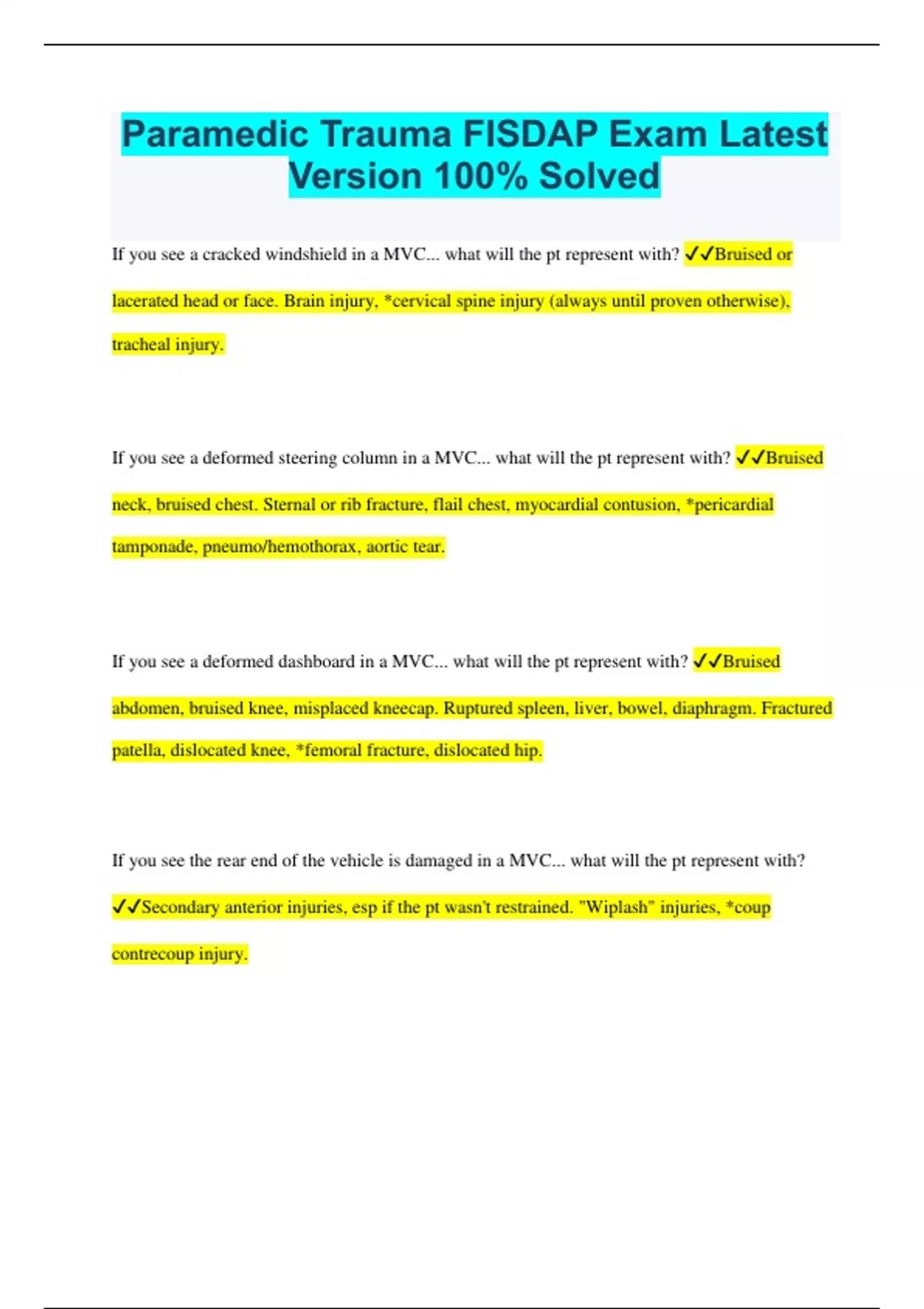 Paramedic Trauma FISDAP Exam Latest Version 100% Solved If you see a cracked windshield in a MVC... what will the pt represent with? Bruised or lacerated head or face. Brain injury, *cervical spine injury (always until proven otherwise), tracheal injury. If you see a deformed steering column in a MVC... what will the pt represent with? Bruised neck, bruised chest. Sternal or rib fracture, flail chest, myocardial contusion, *pericardial tamponade, pneumo/hemothorax, aortic tear. If you see a deformed dashboard in a MVC... what will the pt represent with? Bruised abdomen, bruised knee, misplaced kneecap. Ruptured spleen, liver, bowel, diaphragm. Fractured patella, dislocated knee, *femoral fracture, dislocated hip. If you see the rear end of the vehicle is damaged in a MVC... what will the pt represent with? Secondary anterior injuries, esp if the pt wasn't restrained. "Wiplash" injuries, *coup contrecoup injury. Phases of Deceleration 1) Deceleration of the vehicle, occurs when the vehicle strikes another object & comes to a stop. 2) Deceleration of occupant, which starts during sudden braking & continues through the whole crash. 3) Deceleration of internal organs, that consist of internal organs that continue forward momentum until they're stopped by anatomical restraints. 4) Secondary collisions, which occur when a vehicle occupant is hit by objects moving within the vehicle (loose objects). 5) Additional impacts, that the vehicle may receive when it is hit by a second vehicle or is deflected into another. Velocity "Speed kills"- causes more damage than mass. Seat Belt Use All arguments against seat belt use are unfounded. Airbag Injuries Common injuries include abrasions to the face, chest and arms. Minor corrosive effects can occur because of the cornstarch on the airbag, and it may irritate the skin. Down and Under Pathway Occupant slides under the steering wheel or the dash. The knees hit the dashboard, and transmit energy up the leg, to the femur/pelvis. If the feet are locked in place, it can cause femur fractures. Up and Over Pathway Chest hits the steering wheel, head hits the windshield and anterior portion of the throat hits the top of the steering wheel. Can cause significant head and neck injuries. Head on Impact in Motorcycle Crashes Head on impact- motorcycle strikes another object and stops its forward motion, while the rider continues forward motion until stopped by outside force. This causes the rider to go over the handlebars, which causes femur fractures, and tib fractures. Angular Impact in Motorcycle Crashes The motorcycle strikes an object, or another vehicle at an angel so that the rider sustains direct crushing injuries to the lower extremity between the object and motorcycle. Motorcycle Crashes With any motorcycle crash, the helmet should be removed carefully if airway management techniques cannot be performed with the helmet in place or the helmet doesn't fit properly on the riders head. Pedestrian Injuries Most pedestrian injuries occur at an intersection, at night. First, the pedestrian is hit in the lower extremities with the cars bumpers. Second, the pedestrian is thrown on the top of the car (resulting in brain injuries, and pelvic fractures. Third, the pedestrian hits the ground or some other object after rolling off the top or the side of the vehicle. Waddell Triad Refers to the pattern of automobile pedestrian injuries in children and people of short stature; 1) bumper hits the pelvis/femur instead of the knees, 2) the chest & abdomen hit the grill or low on the hood of the car (sternal & rib fractures), 3) the pt's face hits the hood, then flies back, and hits the ground. Fall Severity Factors 1) Height- determines the velocity of the fall. A fall greater than 15 feet or 2.5-3 times the pt's height will have a greater injury & higher rate of death. 2) Position- children usually land on their heads (more mass), and adults tend to try to land on their feet, cause spinal injuries "Don Juan Syndrome or Lovers Lea