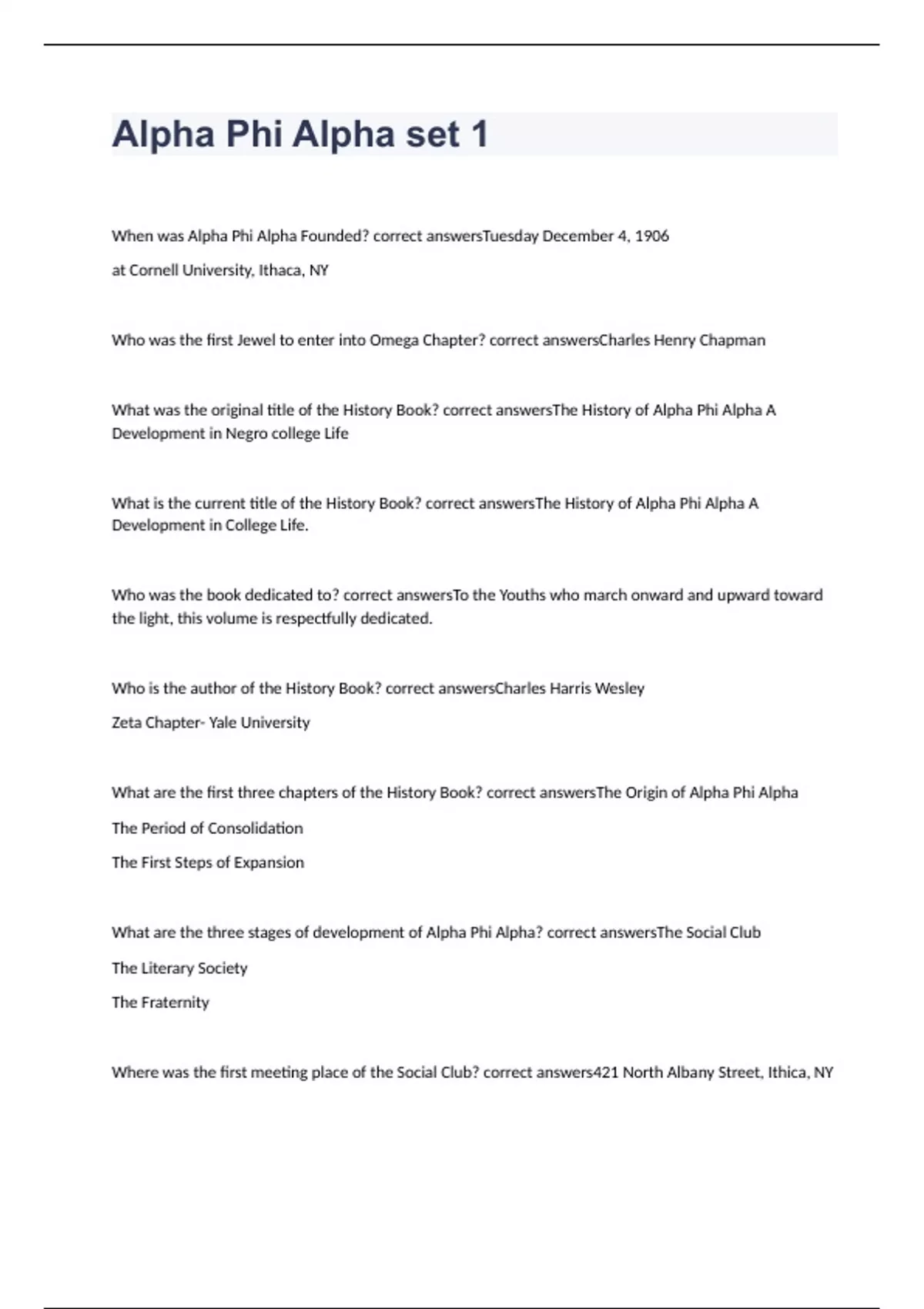 When was Alpha Phi Alpha Founded? correct answersTuesday December 4, 1906 at Cornell University, Ithaca, NY Who was the first Jewel to enter into Omega Chapter? correct answersCharles Henry Chapman What was the original title of the History Book? correct answersThe History of Alpha Phi Alpha A Development in Negro college Life What is the current title of the History Book? correct answersThe History of Alpha Phi Alpha A Development in College Life. Who was the book dedicated to? correct answersTo the Youths who march onward and upward toward the light, this volume is respectfully dedicated. Who is the author of the History Book? correct answersCharles Harris Wesley Zeta Chapter- Yale University What are the first three chapters of the History Book? correct answersThe Origin of Alpha Phi Alpha The Period of Consolidation The First Steps of Expansion What are the three stages of development of Alpha Phi Alpha? correct answersThe Social Club The Literary Society The Fraternity Where was the first meeting place of the Social Club? correct answers421 North Albany Street, Ithica, NY