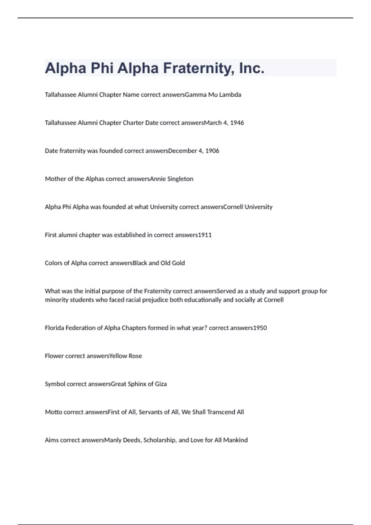 Tallahassee Alumni Chapter Name correct answersGamma Mu Lambda Tallahassee Alumni Chapter Charter Date correct answersMarch 4, 1946 Date fraternity was founded correct answersDecember 4, 1906 Mother of the Alphas correct answersAnnie Singleton Alpha Phi Alpha was founded at what University correct answersCornell University First alumni chapter was established in correct answers1911 Colors of Alpha correct answersBlack and Old Gold What was the initial purpose of the Fraternity correct answersServed as a study and support group for minority students who faced racial prejudice both educationally and socially at Cornell Florida Federation of Alpha Chapters formed in what year? correct answers1950 Flower correct answersYellow Rose Symbol correct answersGreat Sphinx of Giza Motto correct answersFirst of All, Servants of All, We Shall Transcend All Aims correct answersManly Deeds, Scholarship, and Love for All Mankind
