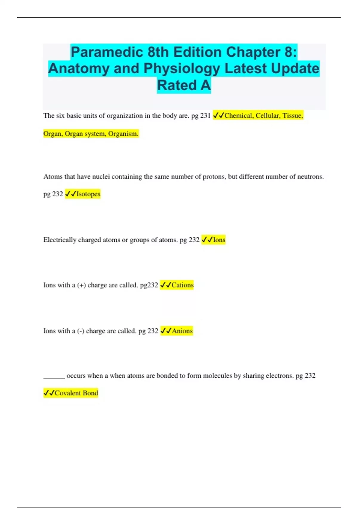 Paramedic 8th Edition Chapter 8: Anatomy and Physiology Latest Update Rated A The six basic units of organization in the body are. pg 231 Chemical, Cellular, Tissue, Organ, Organ system, Organism. Atoms that have nuclei containing the same number of protons, but different number of neutrons. pg 232 Isotopes Electrically charged atoms or groups of atoms. pg 232 Ions Ions with a (+) charge are called. pg232 Cations Ions with a (-) charge are called. pg 232 Anions ______ occurs when a when atoms are bonded to form molecules by sharing electrons. pg 232 Covalent Bond Covalent bonds that do not share electrons equally are called or has an uneven distribution of of charges is called. pg 232 Polar molecules A substance that can be broken down into the two or more elements contained in it. pg 233 Compounds A naturally occurring, inorganic element. 233 Minerals _____ are mostly concentrated in the bones and teeth. pg 233 Minerals When the daily requirement of minerals is 100 mg or more daily. pg 233 Macrominerals When the daily requirement of minerals is less than 100 mg or more daily. pg 233 Microminerals Organic compounds contain what. pg 233 Carbon What compound is essential for many of the chemical reactions necessary to sustain life and includes carbohydrates, proteins, lipids, vitamins, and nucleic acids. pg 233 Biochemical compound ______ are sugars and starches. pg 233 Carbohydrates. (saccharides) A simple sugar is also called. pg 233 Monosaccharides A simple sugar made up of 2 to 10 saccharides are called. pg 233 Oligosaccharides A double sugar is called. pg 233 Disaccharides A complex sugar is called. pg 233 Polysaccharides An important simple sugar found in the blood. pg 233 Glucose (dextrose) A sugar found in fruit juice, honey and galactose. pg 233 Fructose What converts fructose and galactose into glucose in the liver. pg 233 Enzymes Largest internal organ in the body. pg 233 Liver Simple sugars used in the manufacture of of Ribonucleic Acid and Deoxyribonucleic acids. pg 233 Ribose and Deoxyribose What is the main polysaccharide in the body and is the form in which glucose is stored in the human body, primarily the liver and skeletal muscles. pg 233 Glycogen A complex carbohydrate that is not digestible by h