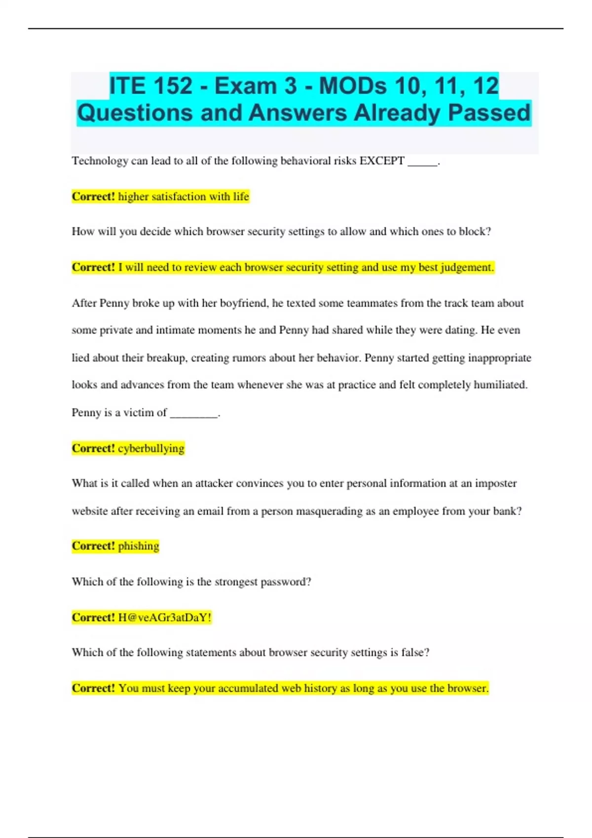 ITE 152 - Exam 3 - MODs 10, 11, 12 Questions and Answers Already Passed Technology can lead to all of the following behavioral risks EXCEPT _____. Correct! higher satisfaction with life How will you decide which browser security settings to allow and which ones to block? Correct! I will need to review each browser security setting and use my best judgement. After Penny broke up with her boyfriend, he texted some teammates from the track team about some private and intimate moments he and Penny had shared while they were dating. He even lied about their breakup, creating rumors about her behavior. Penny started getting inappropriate looks and advances from the team whenever she was at practice and felt completely humiliated. Penny is a victim of ________. Correct! cyberbullying What is it called when an attacker convinces you to enter personal information at an imposter website after receiving an email from a person masquerading as an employee from your bank? Correct! phishing Which of the following is the strongest password? Correct! H@veAGr3atDaY! Which of the following statements about browser security settings is false? Correct! You must keep your accumulated web history as long as you use the browser. How is a worm different from a Trojan? Correct! A worm spreads through a network, whereas a Trojan hides inside another program. _____ ensures that the person requesting access to a computer is not an imposter. Correct! Authentication Isabel received a message on her computer that appeared to be from the FBI. It informed her that her computer has been locked and she would need to pay a fee to retrieve her data. How would you describe what is happening? Correct! It is most likely ransomware because it is telling her she has to verify payment information to unlock her computer. Cassidy is a medical assistant in a hospital and has access to many medical files. When she brings patients to the examining room, she can be observed swiping a card, typing in a password, and staring into what appears to be a camera, all attached to the computer. After completing her check-in, Cassidy leaves the patient in the examining room waiting on the doctor. It is important that she logs out of the system so the patient does not have access to the information stored in the hospital’s database. Based on Cassidy’s actions what systems do you think the hospital has in place to protect the patient medical records? Correct! Biometrics To prevent a laptop from being stolen, you can use a surge protector. Correct! False How can you protect a computer from electrical spikes and surges? Correct! Use a surge protector. What is a digital certificate? Correct! Technology used to verify a user’s identity Creating a(n) _____ means copying files from a computer’s hard drive and storing them in a remote location. Correct! data backup You can configure your wireless router to protect your devices in all of the following ways EXCEPT ____. Correct! naming your router something you’ll remember, like your street address What type of security requires something you know and something you have that no one else has? Correct! two factor authentication Social-networking sites have a history of providing tight security and giving users a clear understanding of how security features work. Correct! False How does encryption work? Correct! It scrambles the information until the key is used to unscramble it. Siobhan has recently opened a Facebook account and as a new user, is posting frequently and accepting many friend requests. You see a post about an upcoming trip and notice that her profile is open to the public. What can you tell Siobhan to help her use social networking safely? Correct! Be cautious about what information she posts. Which of the following is a characteristic of a strong