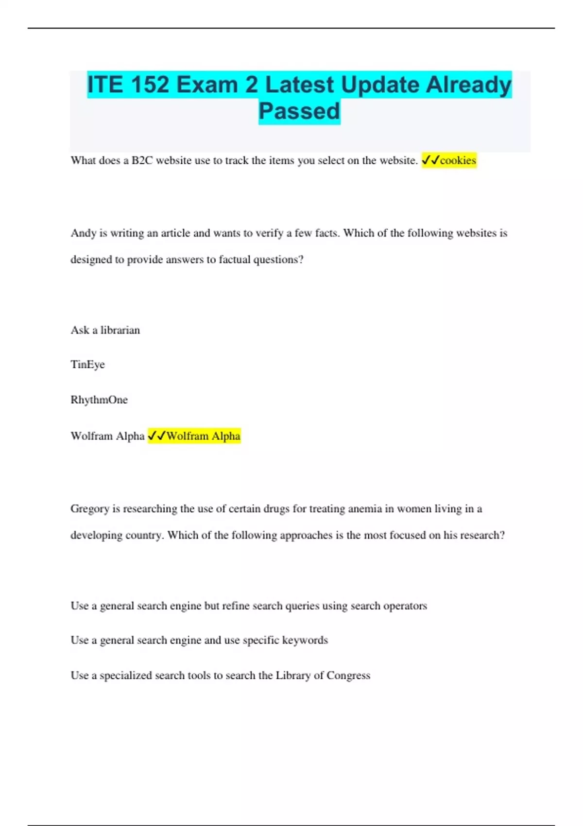 ITE 152 Exam 2 Latest Update Already Passed What does a B2C website use to track the items you select on the website. cookies Andy is writing an article and wants to verify a few facts. Which of the following websites is designed to provide answers to factual questions? Ask a librarian TinEye RhythmOne Wolfram Alpha Wolfram Alpha Gregory is researching the use of certain drugs for treating anemia in women living in a developing country. Which of the following approaches is the most focused on his research? Use a general search engine but refine search queries using search operators Use a general search engine and use specific keywords Use a specialized search tools to search the Library of Congress Use the web directories created by health research institutions Use the web directories created by health research institutions Susan is reading through a collection of webpages that contains information about a software firm. The firm manages the information on these webpages. What is Susan most likely browsing? Her email account Someone's Facebook profile Different pages listed by a search engine The website of a software firm The website of a software firm News360 is a search engine because it gathers, organizes, and then distributes web content. T or F False Ms. Lawson, a primary school teacher, told her students that a photograph of the president is in the public domain. What does she mean by this? The president keeps the copyright to the photo while allowing others to use it The photo uses copy protection software to limit access to the image The president has the legal rights to sell, publish, or distribute the photo The photo is free of copyrights The photo is free of copyrights Keith is researching a controversial topic and wants to use a website he found as an information source. Which of the following is a sign that the website is not a worthwhile resource? The author has no conflict of interest The author uses emotional language to express a single point of view The author supports claims with facts The author is a well known expert on the topic The author uses emotional language to express a single point of view Cathy wants to buy a new watch online, but is concerned about security when making the purchase. Which of the following increases the chance that her payment is NOT secure? Shopping on a website that uses 3D Secure protocol Shopping using an e-wallet Shopping