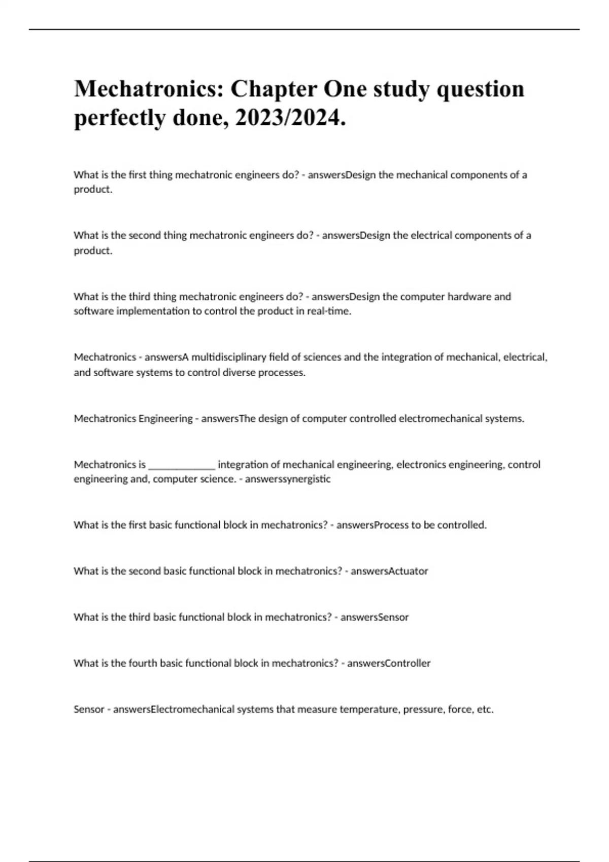 mechatronics - answersA multidisciplinary field of engineering that includes a combination of systems engineering, mechanical engineering, electrical engineering, telecommunications engineering, control engineering and computer engineering. Integration of mechanical and electrical components Robot - answersdevice that performs actions based on programming and sensing. Sense think act Sensors - answersDetect physical output electrical transducer signal processing position sensors - answersrotation is easier differentiate to get velocity switch - answerspushbutton, lever, reset, rocker, slide toggle physical contact user input or limit switch Proximity position sensor - answersnon contact lase, magnetic, capacitive, ultrasonic laser, IR Hall effect sensor - answersreads magnetic fields v changes with magnetic field to zero and avoid obstacles ultrasonic - answerssound pulse and return distance IR - answersLight pulse Opposed: garage door retroreflective: mirror Proxity encoders - answerssenser tick marks as something moves linear and rotary optical or magnetic absolute vs. relative absolute encoder - answers0 to 360 degrees needs more tracks more expensive relative encoder - answerschange in angle (needs to be zeroed) two tracks only cheaper Internal measurement unit (IMU) - answersGyro, accel, compass change in angular velocity, drift (tilt and acceleration), measure north Force/stress/strain sensors - answersstrain gauge, load cell, FSR, peizoelectric piezo - answerscrystal whose voltage is related to shape/compression temperature sensor - answersthermistor: Resistor thermocouple: change in T = V other sensors - answersaccelometer (integrate to get velocity) fluid flow light Actuators - answersproduce action (motion, light, sound) Other actuators - answerspneumatics, hydrolics, light, sound solenoids - answerscheap take a lot of current uses: on/off, valves, latches relay - answerssolenoid used to make/break electronic components voice coil - answerscoil moves, lower inertia electric motors - answersAC, DC (Brushed and Brushless) power winding w/in brushes and commutator commutator mechanism toggles windings very weak but very fast back emf torque speed curve (stall torque, no-load speed)