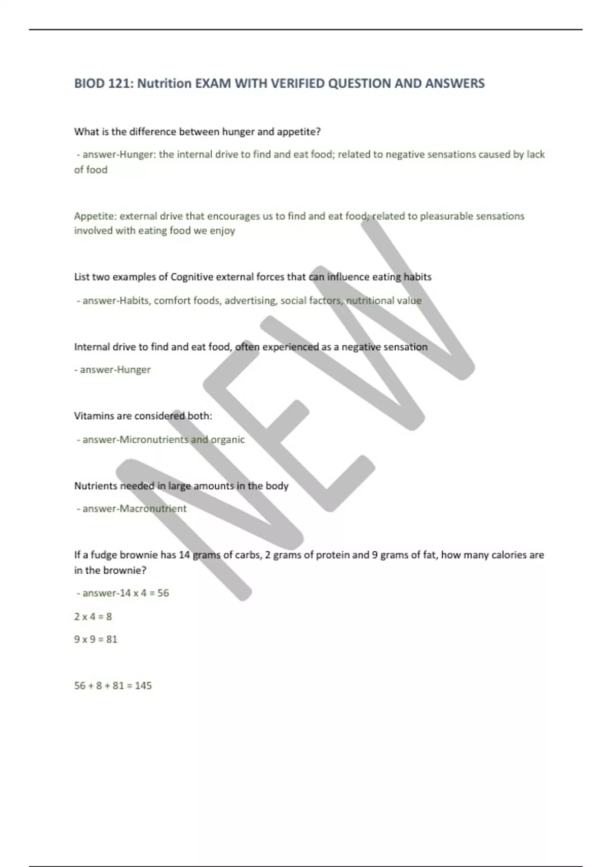 BIOD 121: Nutrition EXAM WITH VERIFIED QUESTION AND ANSWERS BIOD 121: Nutrition EXAM WITH VERIFIED QUESTION AND ANSWERS
