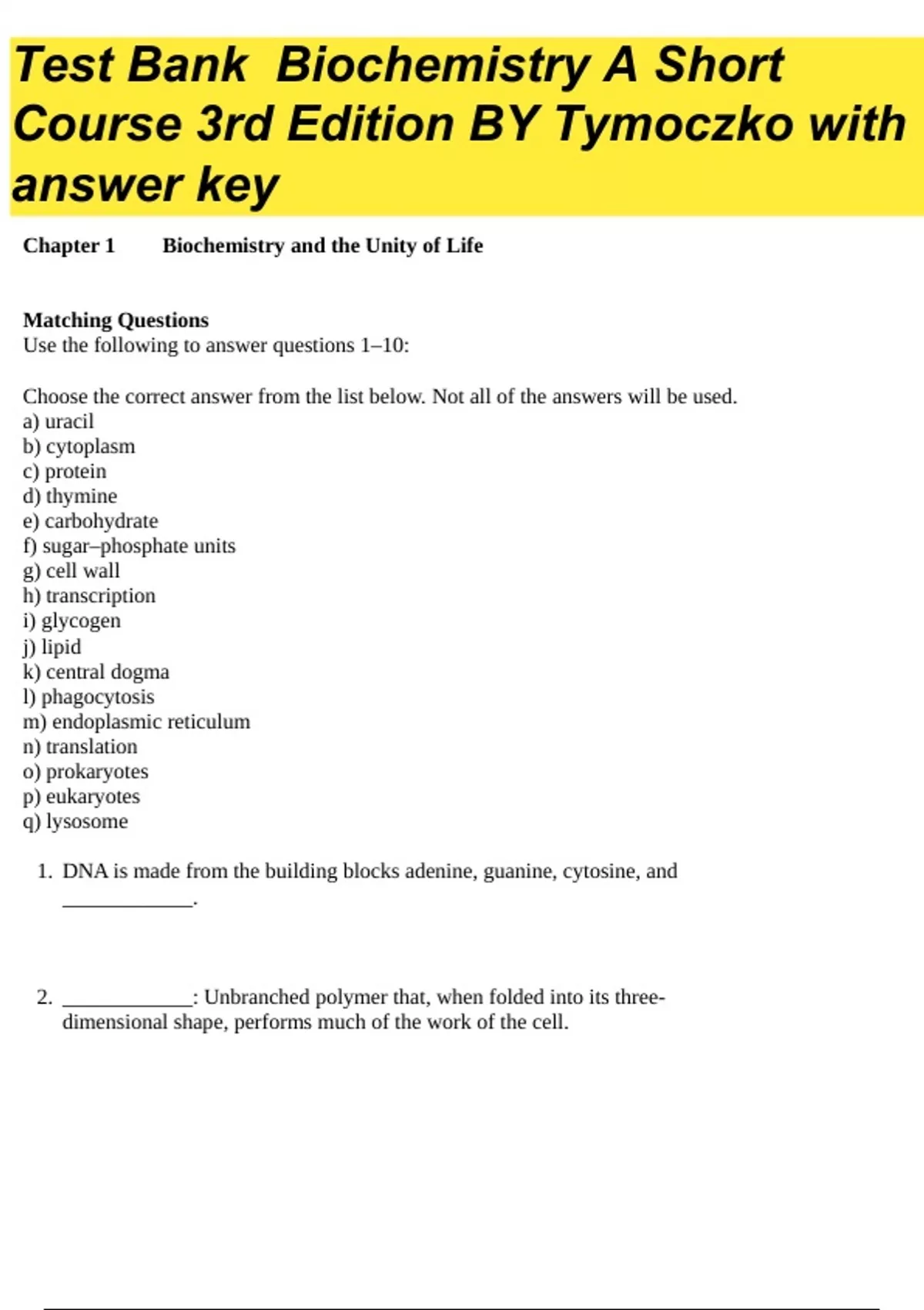 Biochemistry A Short Course 3rd Edition Tymoczko Test Bank