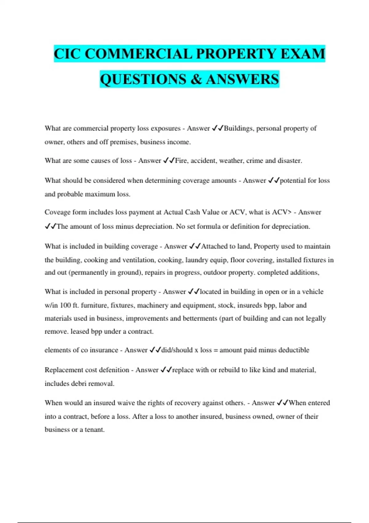 CIC COMMERCIAL PROPERTY EXAM QUESTIONS & ANSWERS What are commercial property loss exposures - Answer ️️ Buildings, personal property of owner, others and off premises, business income. What are some causes of loss - Answer ️️ Fire, accident, weather, crime and disaster. What should be considered when determining coverage amounts - Answer ️️ potential for loss and probable maximum loss. Coveage form includes loss payment at Actual Cash Value or ACV, what is ACV> - Answer ️️ The amount of loss minus depreciation. No set formula or definition for depreciation. What is included in building coverage - Answer ️️ Attached to land, Property used to maintain the building, cooking and ventilation, cooking, laundry equip, floor covering, installed fixtures in and out (permanently in ground), repairs in progress, outdoor property. completed additions, What is included in personal property - Answer ️️ located in building in open or in a vehicle w/in 100 ft. furniture, fixtures, machinery and equipment, stock, insureds bpp, labor and materials used in business, improvements and betterments (part of building and can not legally remove. leased bpp under a contract. elements of co insurance - Answer ️️ did/should x loss = amount paid minus deductible Replacement cost defenition - Answer ️️ replace with or rebuild to like kind and material, includes debri removal. When would an insured waive the rights of recovery against others. - Answer ️️ When entered into a contract, before a loss. After a loss to another insured, business owned, owner of their business or a tenant