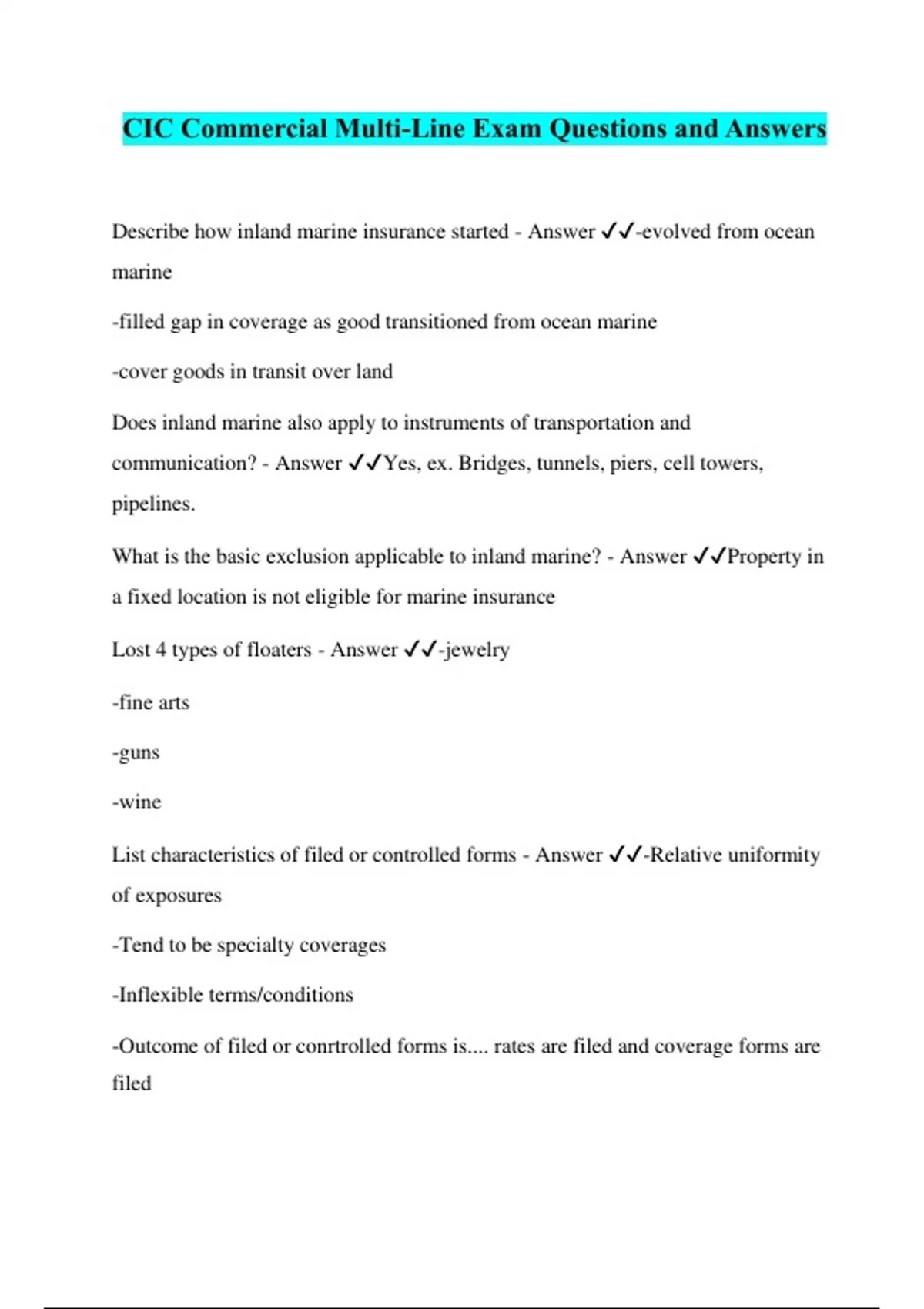 CIC Commercial Multi-Line Exam Questions and Answers Describe how inland marine insurance started - Answer ️️ -evolved from ocean marine -filled gap in coverage as good transitioned from ocean marine -cover goods in transit over land Does inland marine also apply to instruments of transportation and communication? - Answer ️️ Yes, ex. Bridges, tunnels, piers, cell towers, pipelines. What is the basic exclusion applicable to inland marine? - Answer ️️ Property in a fixed location is not eligible for marine insurance Lost 4 types of floaters - Answer ️️ -jewelry -fine arts -guns -wine List characteristics of filed or controlled forms - Answer ️️ -Relative uniformity of exposures -Tend to be specialty coverages -Inflexible terms/conditions -Outcome of filed or conrtrolled forms is.... rates are filed and coverage forms are filed