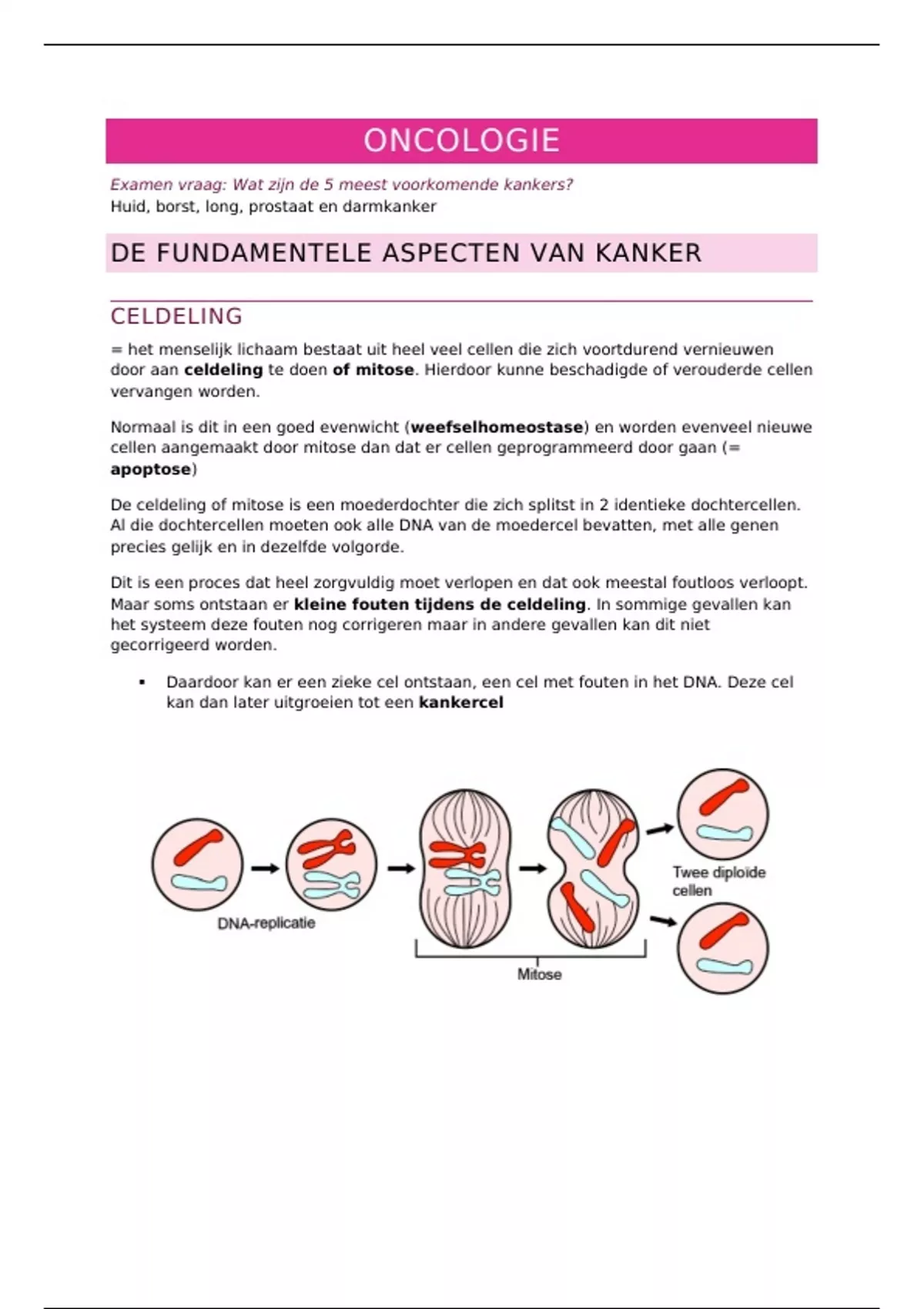 Deze samenvatting gaat over de leer van kanker. Hoe ontstaat kanker en welke zijn de 5 meest voorkomende.