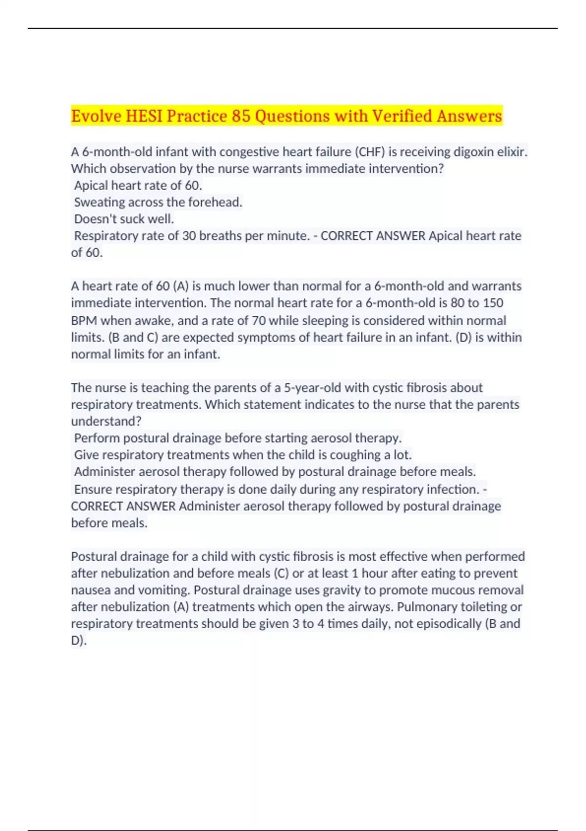 Evolve HESI Practice 85 Questions with Verified Answers A 6-month-old infant with congestive heart failure (CHF) is receiving digoxin elixir. Which observation by the nurse warrants immediate intervention? Apical heart rate of 60. Sweating across the forehead. Doesn't suck well. Respiratory rate of 30 breaths per minute. - CORRECT ANSWER Apical heart rate of 60. A heart rate of 60 (A) is much lower than normal for a 6-month-old and warrants immediate intervention. The normal heart rate for a 6-month-old is 80 to 150 BPM when awake, and a rate of 70 while sleeping is considered within normal limits. (B and C) are expected symptoms of heart failure in an infant. (D) is within normal limits for an infant. The nurse is teaching the parents of a 5-year-old with cystic fibrosis about respiratory treatments. Which statement indicates to the nurse that the parents understand? Perform postural drainage before starting aerosol therapy. Give respiratory treatments when the child is coughing a lot. Administer aerosol therapy followed by postural drainage before meals. Ensure respiratory therapy is done daily during any respiratory infection. - CORRECT ANSWER Administer aerosol therapy followed by postural drainage before meals. Postural drainage for a child with cystic fibrosis is most effective when performed after nebulization and before meals (C) or at least 1 hour after eating to prevent nausea and vomiting. Postural drainage uses gravity to promote mucous removal after nebulization (A) treatments which open the airways. Pulmonary toileting or respiratory treatments should be given 3 to 4 times daily, not episodically (B and D). A female teenager is taking oral tetracycline HCL (Achromycin V) for acne vulgaris. What is the most important instruction for the nurse to include in this client's teaching plan? Use sunscreen when lying by the pool. Cleanse the skin at least 4 times a day. Take the medication with a glass of milk. Menstrual periods may become irregular. - CORRECT ANSWER Use sunscreen when lying by the pool. Photosensitivity is a common side effect of tetracycline HCL (Achromycin V) therapy. Severe sunburn can occur with minimal sun exposure and clients should be instructed to avoid sunlight and to use sunscreen (A). (B and D) are not related to tetracycline HCL (Achromycin V) therapy. (C) should be avoided because dairy products interfere with the absorption of tetracyclines. What preoperative nursing intervention should be included in the plan of care for an infant with pyloric stenosis? Monitor for signs of metabolic acidosis. Estimate the quantity of diarrhea stools. Place in a supine position after feeding. Observe for projectile vomiting. - CORRECT ANSWER Observe for projectile vomiting. Projectile vomiting (D), which contributes to metabolic alkalosis (A), is the classic sign of pyloric stenosis. (B) is not indicated. (C) is dangerous, due to the potential for aspiration with frequent vomiting. An infant is born with a ventricular septal defect (VSD) and surgery is planned to correct the defect. The nurse recognizes that surgical correction is designed to achieve which outcome? Stop the flow of unoxygenated blood into systemic circulation. Increase the flow of unoxygenated blood to the lungs. Prevent the return of oxygenated blood to the lungs. Reduce peripheral tissue hypoxia and nailbed clubbing - CORRECT ANSWER Prevent the return of oxygenated blood to the lungs. Closure of VSDs stops oxygenated blood from being shunted from the left ventricle to the right ventricle (C). VSDs are acyanotic defects, which means that no unoxygenated blood enters the systemic circulation (A and B). (D) is common with Tetrology of Fallot, which is a cyanotic defect. A 3-week-old newborn is brought to the clinic for follow-up after a home birth. The mother reports that her child bottle feeds for 5 minutes only and then falls asleep. The nurse auscultates a loud murmur characteristic of a ventricular septal defect (VSD), and finds the newborn is acyanotic with a respiratory rate of 64 breaths per minute. What instruction should the nurse provide the mother to ensure the infant is receiving adequate intake? (Select all that apply.) A. Monitor the the infant's weight and number of wet diapers per day. B. Increase the infant's intake per feeding by 1 to 2 ounces per week. C. Mix the dose of prophylactic antibiotic in a full bottle of formula. D. Allow the infant to rest and refeed on demand or every 2 hours. E. Use a softer nipple or increase the size of the nipple opening. - CORRECT ANSWER A. Monitor the the infant's weight and number of wet diapers per day. B. Increase the infant's intake per feeding by 1 to 2 ounces per week. D. Allow the infant to rest and refeed on demand or every 2 hours. E. Use a softer nipple or increase the size of the nipple opening. Antibiotic prophylaxis is recommended for infants with VSDs, but should not be mixed in a bottle of formula (C) because it is difficult to ensure that the total dose is consumed. They should be monitored for weight gain and at least 6 wet diapers per day (A). A one-month old infant should ingest 2 to 4 ounces of formula per feeding and progress to about 30 ounces per day by 4-months of age (B) Preoperative nursing care for a child with Wilms' tumor should include which intervention? Gently percuss the abdomen for evidence of trapped air. Observe the abdomen for any noticeable discolorations. Apply cold compresses to the abdomen to reduce edema. Put a sign on the bed reading, "DO NOT PALPATE ABDOMEN." - CORRECT ANSWER Put a sign on the bed reading, "DO NOT PALPATE ABDOMEN." Prevention of abdominal palpation (D) minimizes the risk of rupturing the encapsulated tumor and subsequent metastasis. (A) is unnecessary, and this action could traumatize the tumor in the same manner as palpation. (B and C) are incorrect since the abdomen is not discolored and cold compresses are not indicated. At 8 a.m. the unlicensed assistive personnel (UAP) informs the ch
