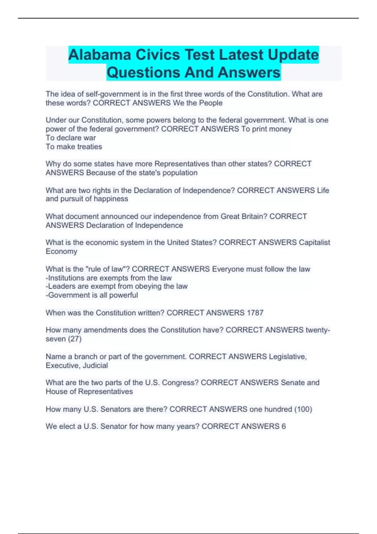 Alabama Civics Test Latest Update Questions And Answers