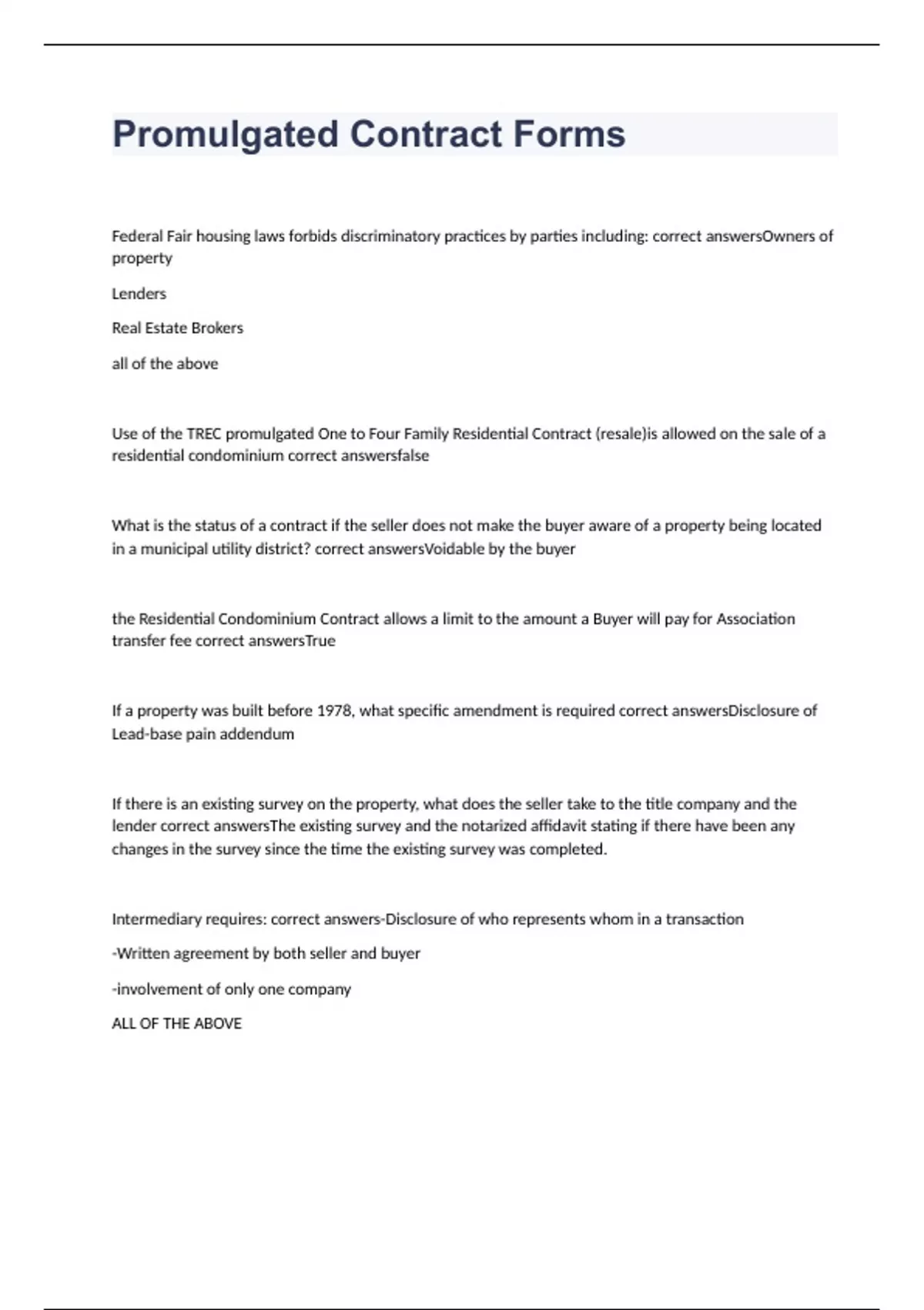Federal Fair housing laws forbids discriminatory practices by parties including: correct answersOwners of property Lenders Real Estate Brokers all of the above Use of the TREC promulgated One to Four Family Residential Contract (resale)is allowed on the sale of a residential condominium correct answersfalse What is the status of a contract if the seller does not make the buyer aware of a property being located in a municipal utility district? correct answersVoidable by the buyer the Residential Condominium Contract allows a limit to the amount a Buyer will pay for Association transfer fee correct answersTrue If a property was built before 1978, what specific amendment is required correct answersDisclosure of Lead-base pain addendum If there is an existing survey on the property, what does the seller take to the title company and the lender correct answersThe existing survey and the notarized affidavit stating if there have been any changes in the survey since the time the existing survey was completed. Intermediary requires: correct answers-Disclosure of who represents whom in a transaction -Written agreement by both seller and buyer -involvement of only one company ALL OF THE ABOVE