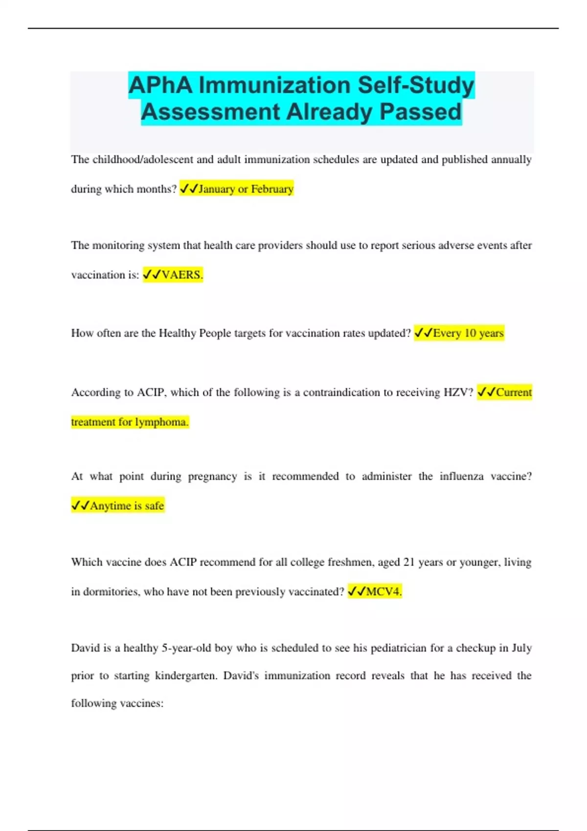 The childhood/adolescent and adult immunization schedules are updated and published annually during which months? January or February The monitoring system that health care providers should use to report serious adverse events after vaccination is: VAERS. How often are the Healthy People targets for vaccination rates updated? Every 10 years According to ACIP, which of the following is a contraindication to receiving HZV? Current treatment for lymphoma. At what point during pregnancy is it recommended to administer the influenza vaccine? Anytime is safe Which vaccine does ACIP recommend for all college freshmen, aged 21 years or younger, living in dormitories, who have not been previously vaccinated? MCV4. David is a healthy 5-year-old boy who is scheduled to see his pediatrician for a checkup in July prior to starting kindergarten. David's immunization record reveals that he has received the following vaccines: