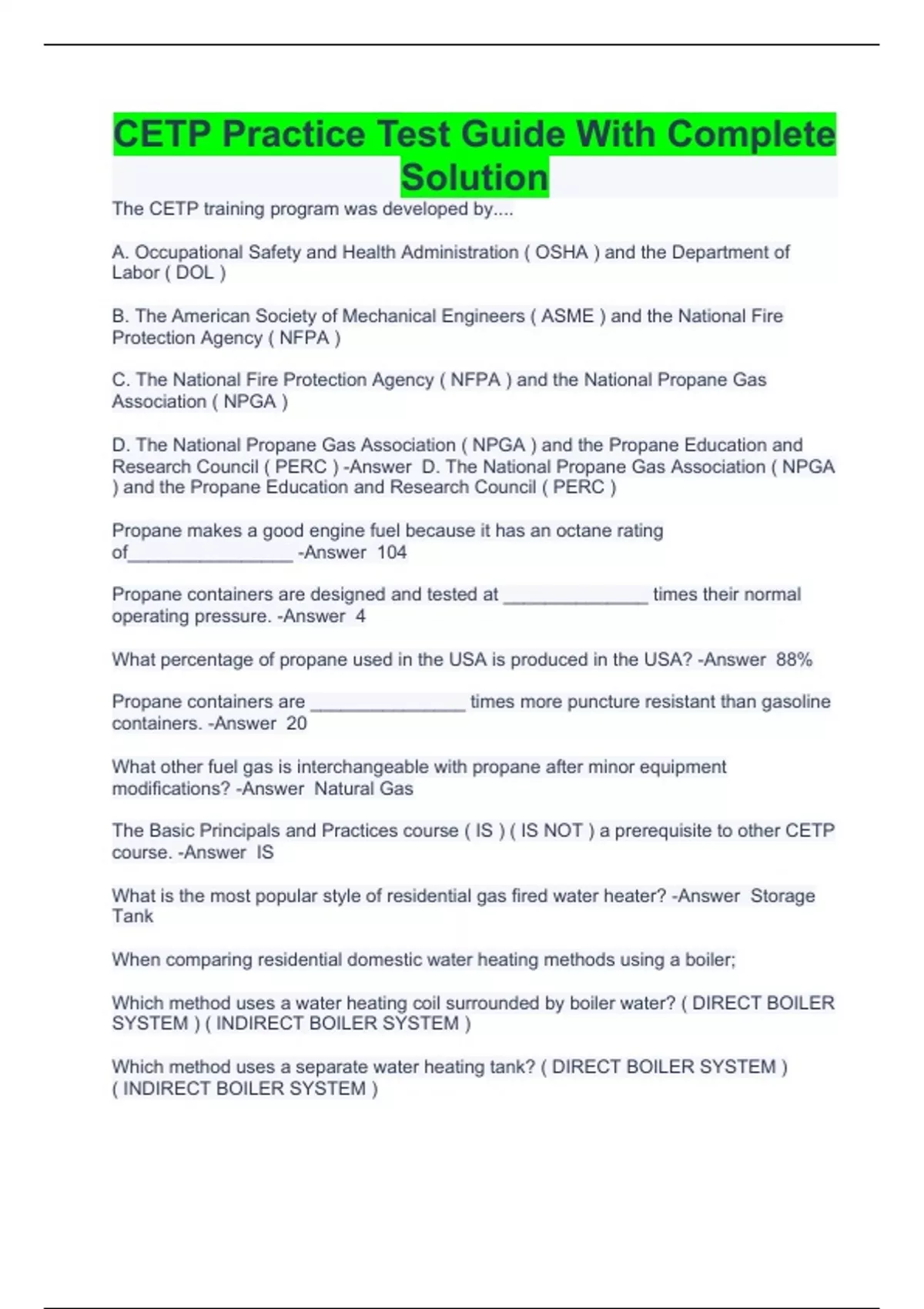 The CETP training program was developed by.... A. Occupational Safety and Health Administration ( OSHA ) and the Department of Labor ( DOL ) B. The American Society of Mechanical Engineers ( ASME ) and the National Fire Protection Agency ( NFPA ) C. The National Fire Protection Agency ( NFPA ) and the National Propane Gas Association ( NPGA ) D. The National Propane Gas Association ( NPGA ) and the Propane Education and Research Council ( PERC ) -Answer D. The National Propane Gas Association ( NPGA ) and the Propane Education and Research Council ( PERC ) Propane makes a good engine fuel because it has an octane rating of________________ -Answer 104 Propane containers are designed and tested at ______________ times their normal operating pressure. -Answer 4 What percentage of propane used in the USA is produced in the USA? -Answer 88% Propane containers are _______________ times more puncture resistant than gasoline containers. -Answer 20 What other fuel gas is interchangeable with propane after minor equipment modifications? -Answer Natural Gas The Basic Principals and Practices course ( IS ) ( IS NOT ) a prerequisite to other CETP course. -Answer IS What is the most popular style of residential gas fired water heater? -Answer Storage Tank When comparing residential domestic water heating methods using a boiler; Which method uses a water heating coil surrounded by boiler water? ( DIRECT BOILER SYSTEM ) ( INDIRECT BOILER SYSTEM ) Which method uses a separate water heating tank? ( DIRECT BOILER SYSTEM ) ( INDIRECT BOILER SYSTEM )