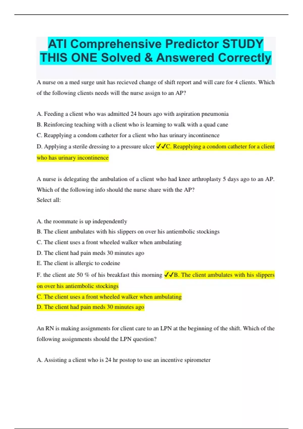 A nurse on a med surge unit has recieved change of shift report and will care for 4 clients. Which of the following clients needs will the nurse assign to an AP? A. Feeding a client who was admitted 24 hours ago with aspiration pneumonia B. Reinforcing teaching with a client who is learning to walk with a quad cane C. Reapplying a condom catheter for a client who has urinary incontinence D. Applying a sterile dressing to a pressure ulcer C. Reapplying a condom catheter for a client who has urinary incontinence A nurse is delegating the ambulation of a client who had knee arthroplasty 5 days ago to an AP. Which of the following info should the nurse share with the AP? Select all: A. the roommate is up independently B. The client ambulates with his slippers on over his antiembolic stockings C. The client uses a front wheeled walker when ambulating D. The client had pain meds 30 minutes ago E. The client is allergic to codeine F. the client ate 50 % of his breakfast this morning B. The client ambulates with his slippers on over his antiembolic stockings C. The client uses a front wheeled walker when ambulating D. The client had pain meds 30 minutes ago An RN is making assignments for client care to an LPN at the beginning of the shift. Which of the following assignments should the LPN question? A. Assisting a client who is 24 hr postop to use an incentive spirometer B. Collecting a clean catch urine specimen from a client who was admitted on the previous shift C. providing nasopharyngeal suctioning for a client who has pneumonia D. Replacing the cartridge and tubing on a PCA pump D. Replacing the cartridge and tubing on a PCA pump A nurse is preparing an inservice program about delegation. Which of the following elements should she identify when presenting the 5 rights of delegation. Select all: A. Right client B. Right supervision/evaluation C. Right direction/communication D. Right time E. Right circumstances B. Right supervision/evaluation C. Right direction/communication E. Right circumstances A nurse manager of a med surge unit is assigning care responsibilities for the oncoming shift. A client is waiting transfer back to the unit from the PACU following thoracic surgery. To which staff member should the nurse assign the client? A. Charge nurse B. RN C. LVN D. AP B. RN A nurse is caring for a client who decides not to have surgery despite significant blockages in his coronary arteries. The nurse understands that this clients choice is an example of what principles? A. Fidelity B. Autonomy C. Justice