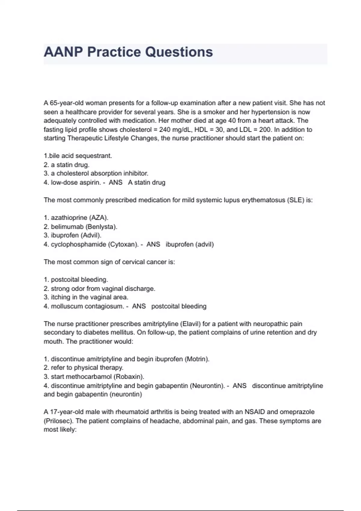AANP Practice Questions And Answers A 65-year-old woman presents for a follow-up examination after a new patient visit. She has not seen a healthcare provider for several years. She is a smoker and her hypertension is now adequately controlled with medication. Her mother died at age 40 from a heart attack. The fasting lipid profile shows cholesterol = 240 mg/dL, HDL = 30, and LDL = 200. In addition to starting Therapeutic Lifestyle Changes, the nurse practitioner should start the patient on: acid sequestrant. 2. a statin drug. 3. a cholesterol absorption inhibitor. 4. low-dose aspirin. - ANS A statin drug The most commonly prescribed medication for mild systemic lupus erythematosus (SLE) is: 1. azathioprine (AZA). 2. belimumab (Benlysta). 3. ibuprofen (Advil). 4. cyclophosphamide (Cytoxan). - ANS ibuprofen (advil) The most common sign of cervical cancer is: 1. postcoital bleeding. 2. strong odor from vaginal discharge. 3. itching in the vaginal area. 4. molluscum contagiosum. - ANS postcoital bleeding The nurse practitioner prescribes amitriptyline (Elavil) for a patient with neuropathic pain secondary to diabetes mellitus. On follow-up, the patient complains of urine retention and dry mouth. The practitioner would: 1. discontinue amitriptyline and begin ibuprofen (Motrin). 2. refer to physical therapy. 3. start methocarbamol (Robaxin). 4. discontinue amitriptyline and begin gabapentin (Neurontin). - ANS discontinue amitriptyline and begin gabapentin (neurontin) A 17-year-old male with rheumatoid arthritis is being treated with an NSAID and omeprazole (Prilosec). The patient complains of headache, abdominal pain, and gas. These symptoms are most likely: 1. associated with the omeprazole. 2. related to the underlying condition. 3. the result of the NSAID. 4. caused by viral gastroenteritis. - ANS associated with the omeprazole The medication of choice for the initial treatment of juvenile rheumatoid arthritis is: 1. acetaminophen. 2. prednisone. 3. aspirin. 4. ibuprofen. - ANS ibuprofen A 12-year-old with sickle cell anemia has recently experienced a sickle cell crisis and presents for a follow-up examination after a recent hospitalization. It is most important to continue monitoring growth, development, and: 1. white blood cell levels. 2. fecal occult blood test. 3. hemoglobin levels. 4. urine dipsticks. - ANS hemoglobin levels A 90-year-old female is brought to the clinic by her neighbor. She states that everything is fine, but the nurse practitioner notes that she has poor hygiene and bruises on her trunk. The neighbor is concerned that the patient often has no money to buy food, despite income from social security and a coal miner's pension. The nurse practitioner suspects abuse. Which of the following is the nurse practitioner obligated to do next? 1. Report the case to the proper authorities. 2. Tell the neighbor to check on the woman daily and report back. 3. Document the data and report the information to risk management. 4. Call the patient's family and inquire about the concerns. - ANS report the case to proper authorities In most cases, the first manifestation of Alzheimer's disease is: 1. impaired judgment. 2. decrease in short-term memory. 3. disorientation in time and place. 4. decrease in long-term memory. - ANS decrease in short-term memory The optimal treatment for latent tuberculosis is: