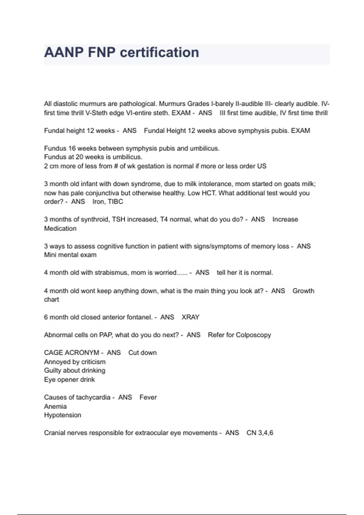 AANP FNP certification Exam Questions And Answers All diastolic murmurs are pathological. Murmurs Grades I-barely II-audible III- clearly audible. IV- first time thrill V-Steth edge VI-entire steth. EXAM - ANS III first time audible, IV first time thrill Fundal height 12 weeks - ANS Fundal Height 12 weeks above symphysis pubis. EXAM Fundus 16 weeks between symphysis pubis and umbilicus. Fundus at 20 weeks is umbilicus. 2 cm more of less from # of wk gestation is normal if more or less order US 3 month old infant with down syndrome, due to milk intolerance, mom started on goats milk; now has pale conjunctiva but otherwise healthy. Low HCT. What additional test would you order? - ANS Iron, TIBC 3 months of synthroid, TSH increased, T4 normal, what do you do? - ANS Increase Medication 3 ways to assess cognitive function in patient with signs/symptoms of memory loss - ANS Mini mental exam 4 month old with strabismus, mom is worried...... - ANS tell her it is normal. 4 month old wont keep anything down, what is the main thing you look at? - ANS Growth chart 6 month old closed anterior fontanel. - ANS XRAY Abnormal cells on PAP, what do you do next? - ANS Refer for Colposcopy CAGE ACRONYM - ANS Cut down Annoyed by criticism Guilty about drinking Eye opener drink Causes of tachycardia - ANS Fever Anemia Hypotension Cranial nerves responsible for extraocular eye movements - ANS CN 3,4,6