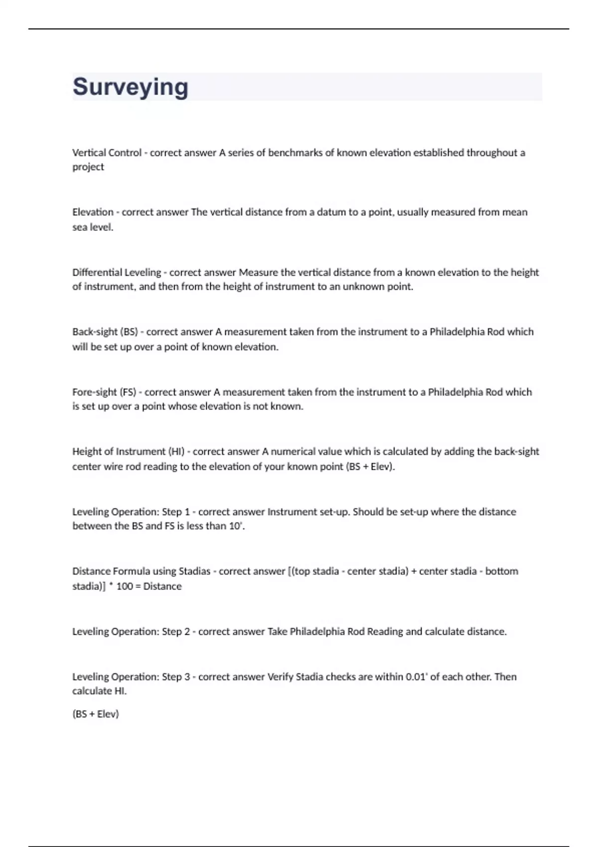 Surveying Questions with complete solution 2023/2024Vertical Control - correct answer A series of benchmarks of known elevation established throughout a project Elevation - correct answer The vertical distance from a datum to a point, usually measured from mean sea level. Differential Leveling - correct answer Measure the vertical distance from a known elevation to the height of instrument, and then from the height of instrument to an unknown point. Back-sight (BS) - correct answer A measurement taken from the instrument to a Philadelphia Rod which will be set up over a point of known elevation. Fore-sight (FS) - correct answ