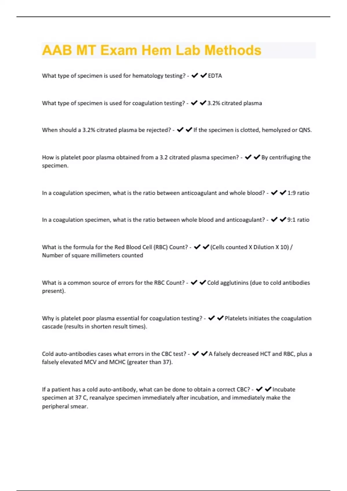 AAB MT Exam Hem Lab Methods Questions And Answers Already Passed!!