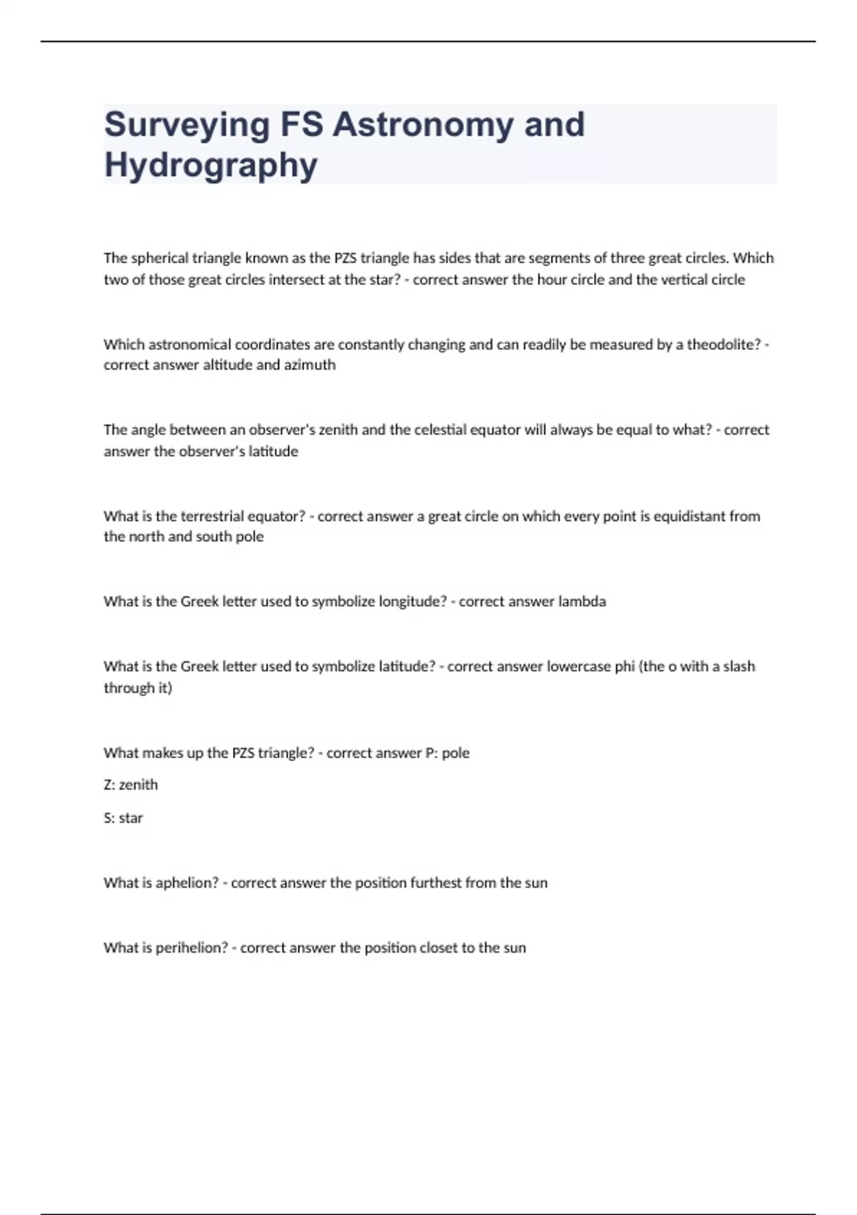 Surveying FS Astronomy and Hydrography Question and answers rated A+ 2023/2024The spherical triangle known as the PZS triangle has sides that are segments of three great circles. Which two of those great circles intersect at the star? - correct answer the hour circle and the vertical circle Which astronomical coordinates are constantly changing and can readily be measured by a theodolite? - correct answer altitude and azimuth The angle between an observer's zenith and the celestial equator will always be equal to what? - correct answer the observer's latitude What is the terrestrial equator? - correct answer a great circle on which every point is equidistant from the north and south pole