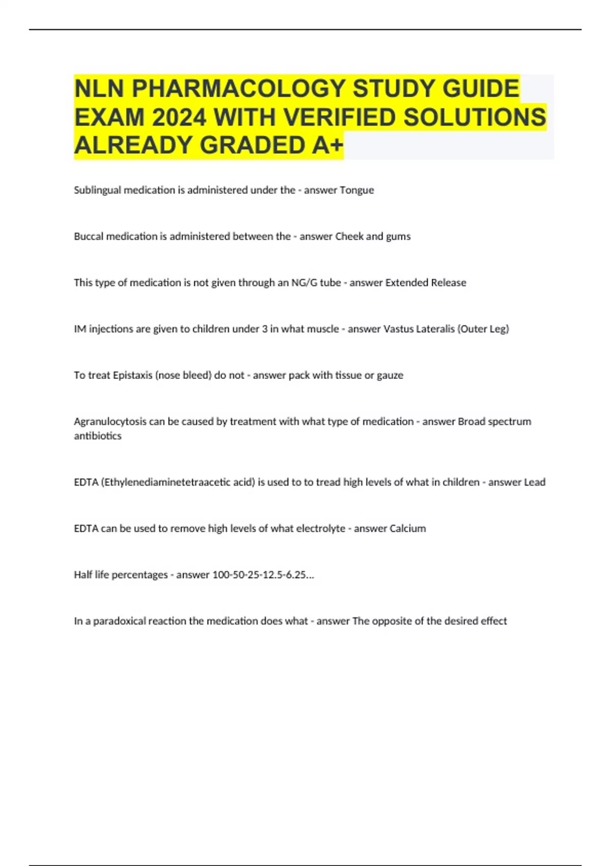 NLN PHARMACOLOGY STUDY GUIDE EXAM 2024 WITH VERIFIED SOLUTIONS ALREADY GRADED +