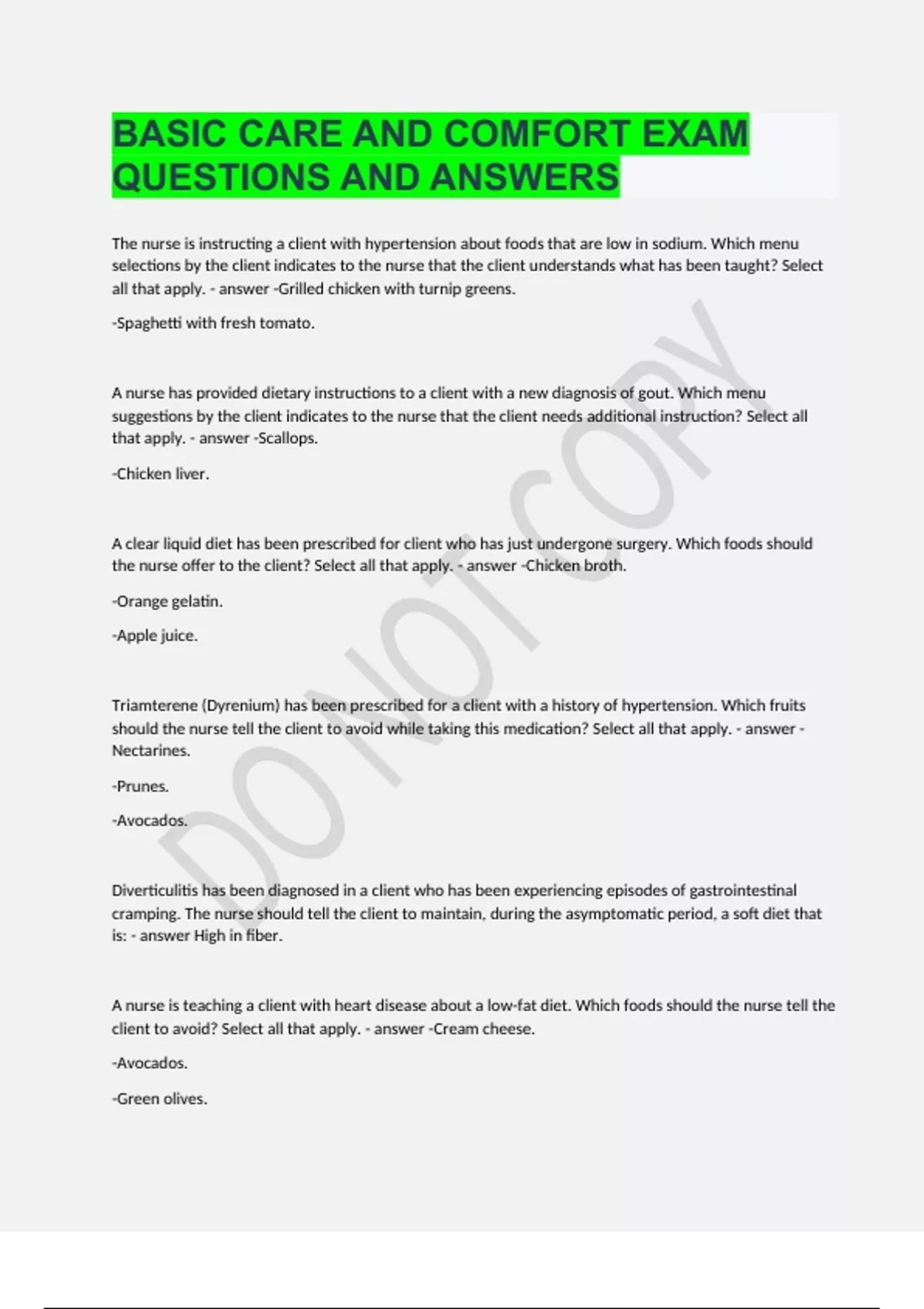 The nurse is instructing a client with hypertension about foods that are low in sodium. Which menu selections by the client indicates to the nurse that the client understands what has been taught? Select all that apply. -Grilled chicken with turnip greens. -Spaghetti with fresh tomato. A nurse has provided dietary instructions to a client with a new diagnosis of gout. Which menu suggestions by the client indicates to the nurse that the client needs additional instruction? Select all that apply. -Scallops. -Chicken liver. Brainpower Read More Previous Play Next Rewind 10 seconds Move forward 10 seconds Unmute 0:00 / 0:00 Full screen A clear liquid diet has been prescribed for client who has just undergone surgery. Which foods should the nurse offer to the client? Select all that apply. -Chicken broth. -Orange gelatin. -Apple juice. Triamterene (Dyrenium) has been prescribed for a client with a history of hypertension. Which fruits should the nurse tell the client to avoid while taking this medication? Select all that apply. -Nectarines. -Prunes. -Avocados. Diverticulitis has been diagnosed in a client who has been experiencing episodes of gastrointestinal cramping. The nurse should tell the client to maintain, during the asymptomatic period, a soft diet that is: High in fiber. A nurse is teaching a client with heart disease about a low-fat diet. Which foods should the nurse tell the client to avoid? Select all that apply. -Cream cheese. -Avocados. -Green olives. A client with atrial fibrillation has been placed on warfarin sodium (Coumadin). As part of the instructions for the medication, which of the following foods does the nurse tell the client to avoid? Select all that apply. -Cabbage. -Broccoli. -Lettuce. A regular diet has been prescribed for a client with a leg fracture who has been placed in skeletal traction. Which foods that will promote wound healing does the nurse encourage the client to select from the hospital menu? Chicken breast, broccoli, strawberries, milk. A client who experienced a brain attack (stroke) is experiencing residual dysphagia. Which of the following foods would the nurse remove from the client's meal tray? Peas. A client recovering from acute renal failure is being discharged home. The nurse knows that the client understands the therapeutic dietary regimen when the client states that he will plan to eat foods that are low in: Potassium. A client is resuming eating after undergoing partial gastrectomy. What does the nurse tell the client to avoid doing as a means of minimizing the risk of complications? Drinking liquids with meals. A client with renal calculi is instructed to follow an alkaline ash diet. Which menu choice by the client indicates to the nurse that the client understands the prescribed regimen? Spinach salad, milk, and a banana. A client who has sustained multiple fractures of the left leg is in skeletal traction. The nurse has obtained an overhead trapeze to improve the client's bed mobility. To which of the following high-risk areas must the nurse pay particular attention during assessment for indications of pressure and skin breakdown? Right heel. Which food should the nurse offer to a client who has been prescribed a full liquid diet? Cooked custard. A client with heart failure and hypertension who has been admitted to the hospital is unable to make her own selections from the menu. Which of the following meals does the nurse select for the client's supper on the day of admission? Turkey, baked potato, salad with oil and vinegar. The nurse teaches a client who has begun taking phenelzine (Nardil), a monoamine oxidase inhibitor (MAOI), about the medication. Which foods are allowed in the diet of the client taking phenelzine? Select all that apply. -Peas. -Broccoli. -Potatoes. A client with a genitourinary tract infection has been prescribed metronidazole (Flagyl) and fluid therapy. The nurse concludes that the client understands the dietary regimen to be followed while taking the medication when the client states that she must avoid: Alcohol. Calcitriol (Rocaltrol) is prescribed for a client with hypocalcemia. Which foods does the nurse, knowing that they may interfere with calcium absorption, instruct the client to limit in the diet? Select all that apply. -Bran. -Spinach. The nurse provides instructions to a client who is beginning therapy with theophylline (Theo-24). The nurse recognizes that the client understands the instructions when the client states that he will be sure to limit consumption of: Coffee, cola, and chocolate. A client with a urinary tract infection has been started on nitrofurantoin (Macrodantin), a urinary antiseptic medication, and is taught about the foods that will maintain the urinary pH in the acid range. Which food does the nurse tell the client to avoid while taking this medication? Rhubarb. For which vitamin deficiency should the nurse monitor the client who is on a vegan diet? Vitamin B12. A client with cirrhosis has an increased ammonia level. Which diet does the nurse anticipate will be of benefit to the client? One low in protein. A nurse provides dietary instructions to a client with cholecystitis. Which menu selection by the client indicates to the nurse that the client understands the instructions? Roast turkey with a baked potato. A client is found to have ulcerative colitis, and the nurse provides instructions to the client about the diet that he should follow while the disease is in remission. Which menu selection by the client indicates to the nurse that the client understands the instructions? Boiled potatoes. A nurse has taught a client with a new colostomy about measures to control stool odor in the ostomy drainage bag. Which of the following foods listed on the client's shopping list indicate to the nurse that the client has understood the information? Select all that apply. -Cranberry juice. -Parsley. -Yogurt. A nurse is teaching a client with an ileostomy about foods that could result in the p