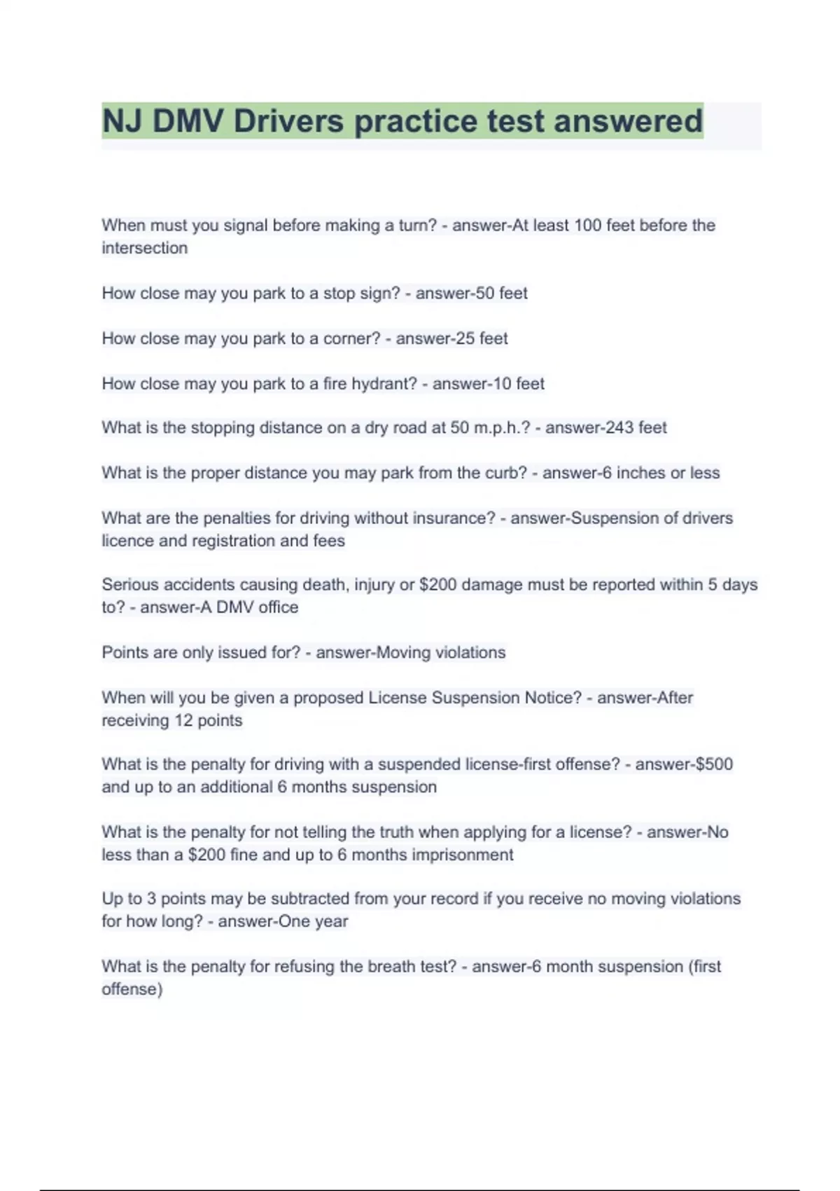 - NJ DMV Drivers practice tet answeed