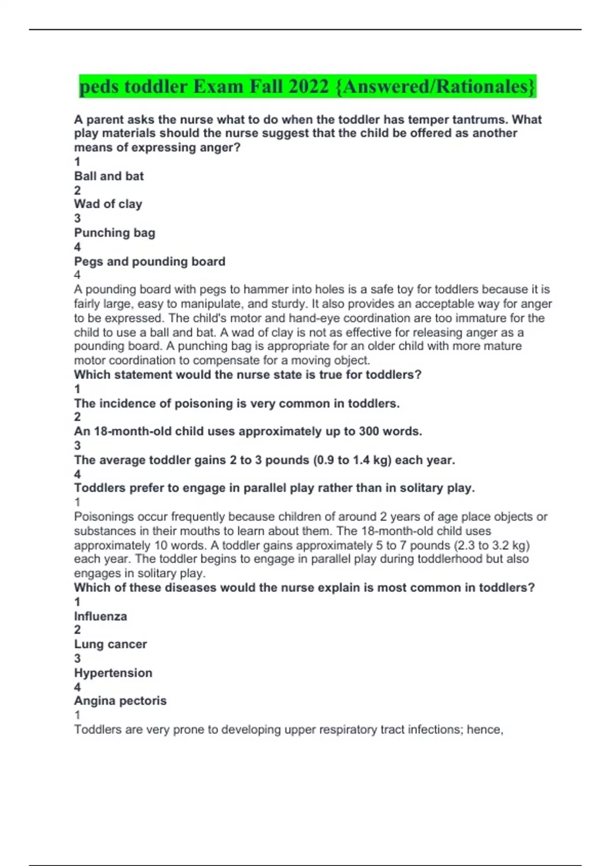 peds toddler Exam Fall 2022 {Answered/Rationales} A parent asks the nurse what to do when the toddler has temper tantrums. What play materials should the nurse suggest that the child be offered as another means of expressing anger? 1 Ball and bat 2 Wad of clay 3 Punching bag 4 Pegs and pounding board 4 A pounding board with pegs to hammer into holes is a safe toy for toddlers because it is fairly large, easy to manipulate, and sturdy. It also provides an acceptable way for anger to be expressed. The child's motor and hand-eye coordination are too immature for the child to use a ball and bat. A wad of clay is not as effective for releasing anger as a pounding board. A punching bag is appropriate for an older child with more mature motor coordination to compensate for a moving object. Which statement would the nurse state is true for toddlers? 1 The incidence of poisoning is very common in toddlers. 2 An 18-month-old child uses approximately up to 300 words. 3 The average toddler gains 2 to 3 pounds (0.9 to 1.4 kg) each year. 4 Toddlers prefer to engage in parallel play rather than in solitary play. 1 Poisonings occur frequently because children of around 2 years of age place objects or substances in their mouths to learn about them. The 18-month-old child uses approximately 10 words. A toddler gains approximately 5 to 7 pounds (2.3 to 3.2 kg) each year. The toddler begins to engage in parallel play during toddlerhood but also engages in solitary play. Which of these diseases would the nurse explain is most common in toddlers? 1 Influenza 2 Lung cancer 3 Hypertension 4 Angina pectoris 1 Toddlers are very prone to developing upper respiratory tract infections; hence, influenza is seen most frequently among toddlers. Lung cancer is seen commonly in younger or middle-aged adults from smoking. Hypertension is commonly seen in middle age due to an unhealthy diet, lack of exercise, and stress. Angina is common in young and middle-aged adults. A nurse teaches the mother of a 2-year-old child who has celiac disease which foods to avoid. Which foods identified by the mother indicate that she understands the teaching? 1 Bacon and eggs 2 Macaroni and cheese 3 Tuna salad and rice cakes 4 Chicken leg and corn on the cob 2 Children with celiac disease cannot digest the gliadin component of gluten. Foods containing grains such as wheat, rye, oats, and barley should be avoided; macaroni is contraindicated because it is a wheat product. Bacon and eggs, tuna and rice cakes, and chicken and corn are gluten-free foods. Which pain scale should a nurse use to measure the intensity of pain in toddlers? 1 FACES scale 2 Visual analogue scale 3 Numerical rating scale 4 Verbal descriptor scale 1 The nurse should use a FACES scale to measure the intensity of pain in children. The scale consists of six cartoon faces ranging from a smiling face ("no hurt") to increasingly less happy faces and finally to a sad, tearful face ("hurts worst"). The visual analogue scale, numerical rating scale, and verbal descriptor scale can be used in young children and adults. Which Korotkoff sound represents the diastolic blood pressure in toddlers? 1 First 2 Third 3 Fourth 4 Fifth 3 The fourth Korotkoff sound is muffled and low. This sound is the diastolic pressure in toddlers. The first Korotkoff sound is sharp and represents systolic blood pressure. The third Korotkoff sound is crispier and includes intense tapping. The fifth Korotkoff sound marks the disappearance of sound. In adolescents and adults the fifth sound corresponds with the diastolic pressure. A 3-year-old child has been observed in the clinic waiting room taking toys from others, tearing pages out of books, and striking the mother. The nurse takes time when interviewing the mother to ask about television habits because of what reason? 1 Viewing violent programs is positively correlated with the development of aggression. 2 The nurse is interested in how much time the mother spends in interactions with the child. 3 Watching Sesame Street and other children's shows results in slow cognitive development. 4 There is a direct connection between the number of hours of television viewed and toddler aggression. 1 Watching violent programs is positively correlated with the development of aggression. Television viewing time does not necessarily have anything to do with interaction time with the mother. Children's shows have not been shown to slow cognitive development. There are no statistics stating specifically that the number of hours of television watched correlates directly with an intensification of aggression. What does the nurse explain happens during the transition from infanthood to toddlerhood? 1 Reduced activity levels 2 Increased need for fats 3 Increased food choices 4 Reduced need for sleep 4 As the infant enters the toddler stage, the need for sleep declines and the activity level increases. Toddlers need less fat and more proteins. Children establish lifetime eating habits during toddlerhood, and there is increased emphasis on food choices. A toddler on the pediatric unit is required to have temporary dietary restrictions after colorectal surgery. What is the best way for the nurse to promote adherence to the restrictions? 1 By limiting restrictions to nonessential foods 2 By handling dietary changes in a matter-of-fact way 3 By having the dietitian explain the restrictions to the parents 4 By arranging to have an adult other than a parent stay at mealtime 2 Toddlers are ritualistic and do not tolerate change well; any change in diet should be done matter of factly. Because of their characteristic struggle for autonomy, toddlers should not be forced to eat. Limited restrictions on nonessential foods are not always possible. Although the parents should consult with the dietitian, this will not affect the toddler's response to the dietary restrictions. The toddler is still dependent on the parents and therefore will respond better to them than to a stranger What is