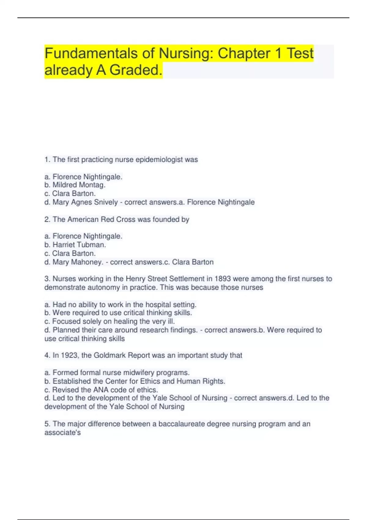 Fundamentals of Nursing: Chapter 1 Test already A Graded. 1. The first practicing nurse epidemiologist was a. Florence Nightingale. b. Mildred Montag. c. Clara Barton. d. Mary Agnes Snively - correct answers.a. Florence Nightingale 2. The American Red Cross was founded by a. Florence Nightingale. b. Harriet Tubman. c. Clara Barton. d. Mary Mahoney. - correct answers.c. Clara Barton 3. Nurses working in the Henry Street Settlement in 1893 were among the first nurses to demonstrate autonomy in practice. This was because those nurses a. Had no ability to work in the hospital setting. b. Were required to use critical thinking skills. c. Focused solely on healing the very ill. d. Planned their care around research findings. - correct answers.b. Were required to use critical thinking skills 4. In 1923, the Goldmark Report was an important study that a. Formed formal nurse midwifery programs. b. Established the Center for Ethics and Human Rights. c. Revised the ANA code of ethics. d. Led to the development of the Yale School of Nursing - correct answers.d. Led to the development of the Yale School of Nursing 5. The major difference between a baccalaureate degree nursing program and an associate's degree nursing program is that the baccalaureate program includes studies in a. Basic sciences and theoretical courses. b. Social sciences and humanities. c. Theoretical and clinical courses. d. Basic sciences and clinical courses. - correct answers.b. Social sciences and humanities 6. The nurse has been working in the clinical setting for several years as an advanced practice nurse and has earned her master's degree as a family nurse practitioner. However, she seems unfulfilled and has a strong desire to do research. To fulfill her desire, the nurse most likely would apply to attend a program that would lead to a a. Doctor of Nursing Science degree (DNSc). b. Doctor of Philosophy degree (PhD). c. Doctor of Nursing Practice degree (DNP). d. Doctor in the Science of Nursing degree (DSN). - correct answers.b. Doctor of Philosophy degree (PhD) 7. The nurse is caring for her patients and is focused on managing their care as opposed to managing and performing skills. This nurse demonstrates which level of proficiency according to Benner? a. Novice b. Competent c. Proficient d. Expert - correct answers.c. Proficient 8. Which of the following resources guides faculty on structure and evaluation of the nursing curriculum? a. ANA's Standards of Nursing Practice b. Essentials of Baccalaureate Education c. NLNAC Interpretive Guidelines d. Standards of Professional Performance - correct answers.b. Essentials of Baccalaureate Education 9. The nurse is caring for the patient who has had major abdominal surgery and also has a large sacral pressure sore. The nurse implements coughing and deep breathing exercises and