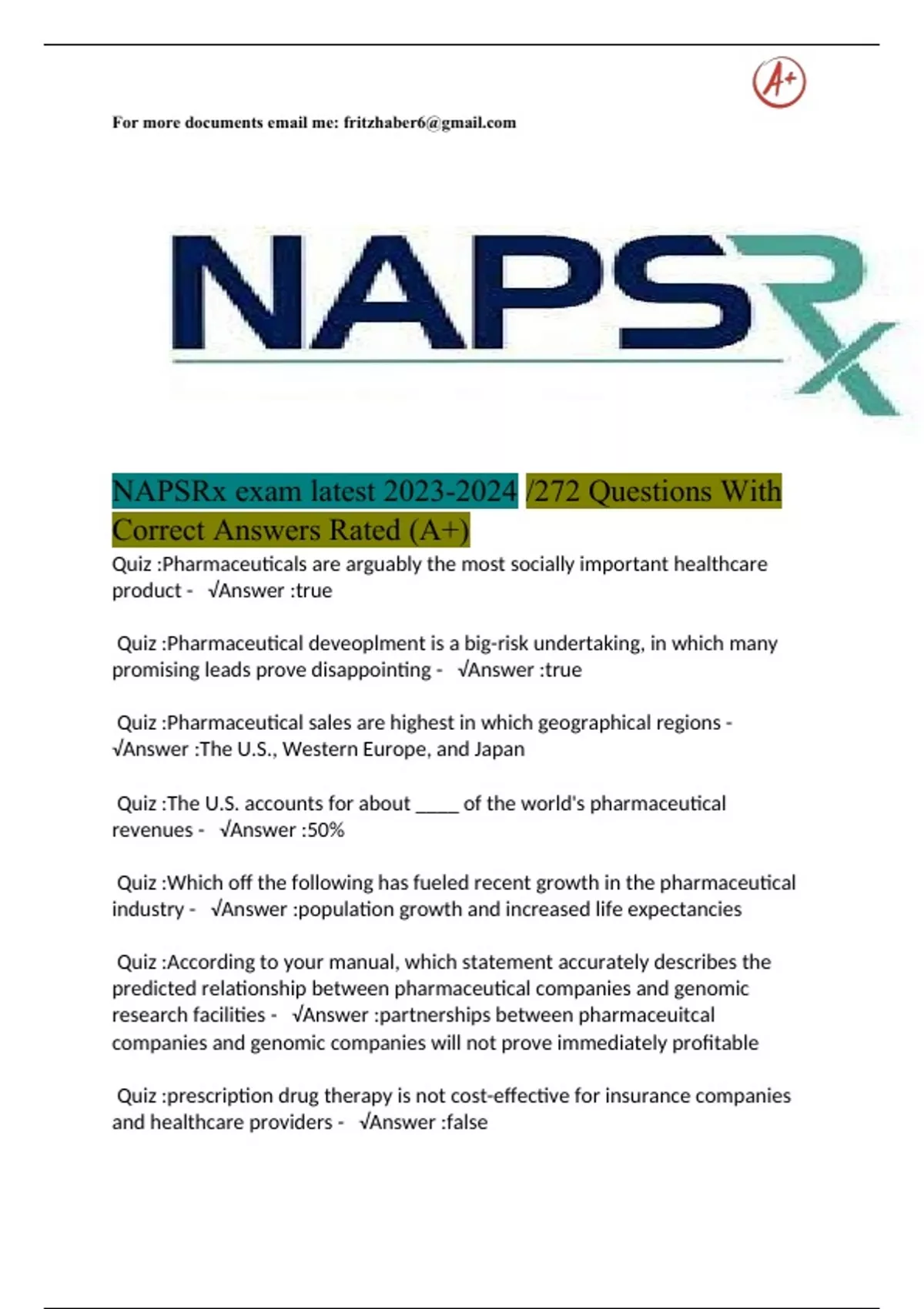NAPSRx exam latest Questions With Correct Answers Rated (A+)