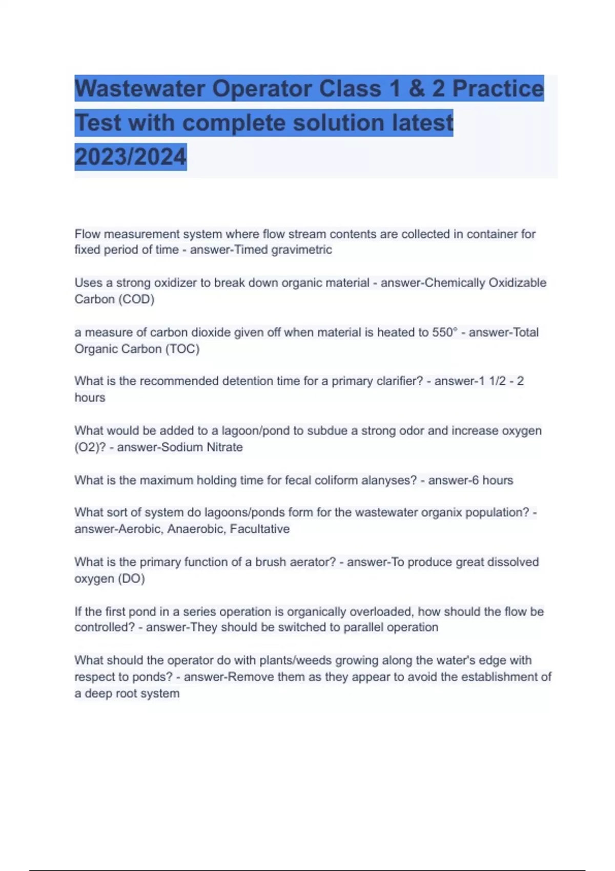 - Wastewater Operator Class 1 & 2 Practice Tst with