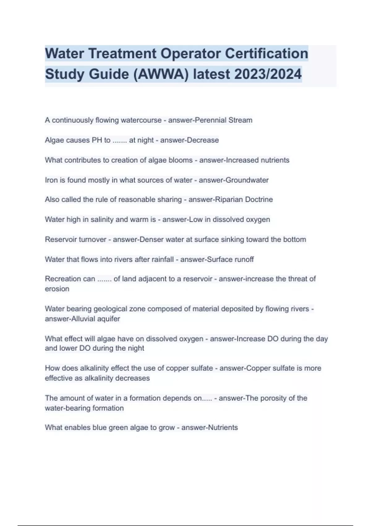 Water Treatment Operator Certification Study Guide (AWWA) latest 2023/2024