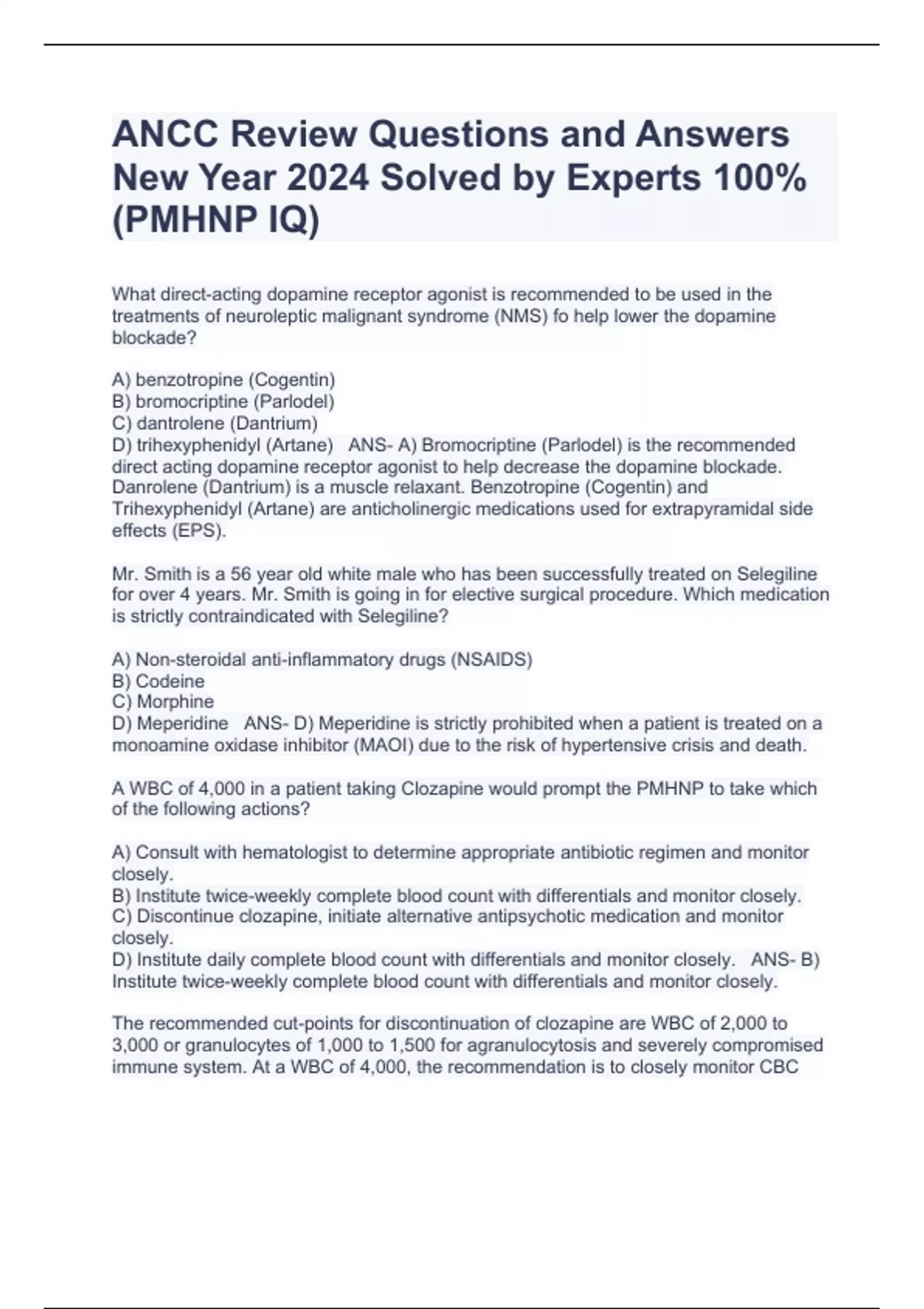 ANCC Review Questions and Answers New Year 2024 Solved by Experts 100%(PMHNP IQ)
