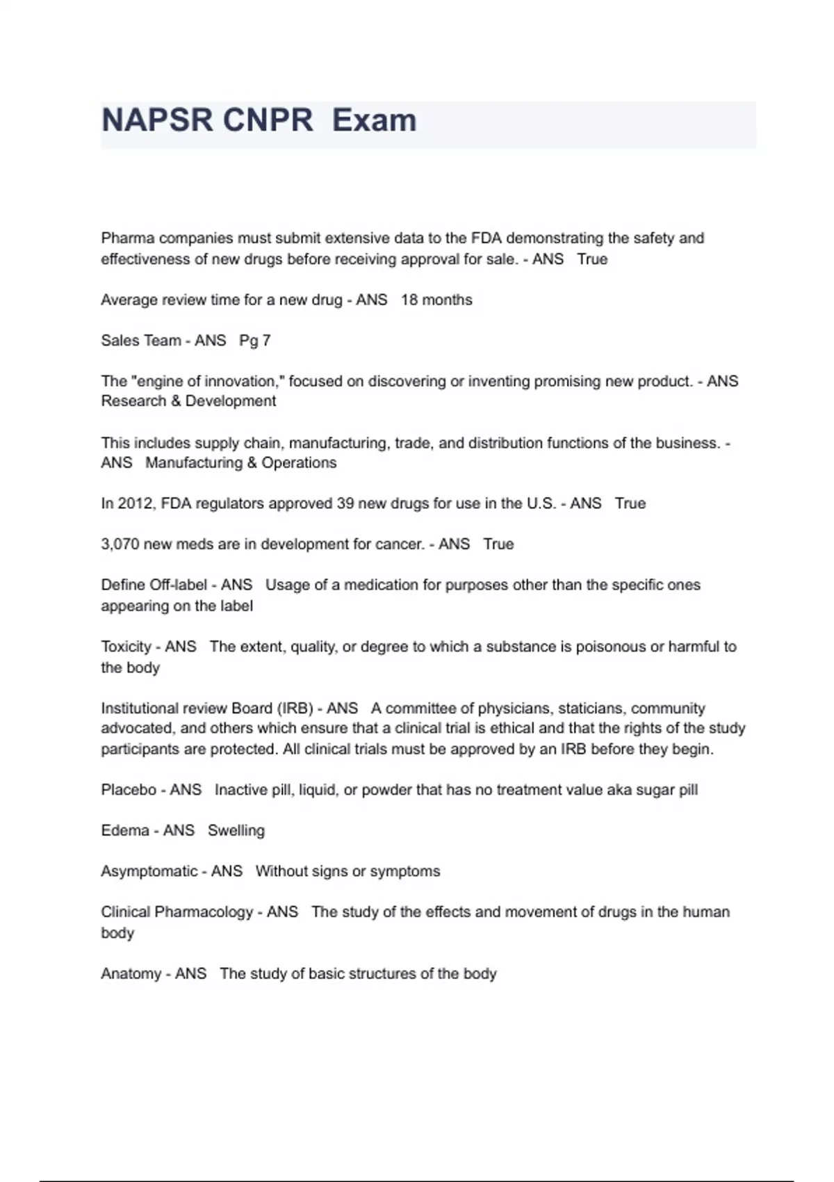 NAPSR CNPR Exam Pharma companies must submit extensive data to the FDA demonstrating the safety and effectiveness of new drugs before receiving approval for sale. - ANS True Average review time for a new drug - ANS 18 months Sales Team - ANS Pg 7 The "engine of innovation," focused on discovering or inventing promising new product. - ANS Research & Development This includes supply chain, manufacturing, trade, and distribution functions of the business. - ANS Manufacturing & Operations In 2012, FDA regulators approved 39 new drugs for use in the U.S. - ANS True 3,070 new meds are in development for cancer. - ANS True Define Off-label - ANS Usage of a medication for purposes other than the specific ones appearing on the label Toxicity - ANS The extent, quality, or degree to which a substance is poisonous or harmful to the body Institutional review Board (IRB) - ANS A committee of physicians, staticians, community advocated, and others which ensure that a clinical trial is ethical and that the rights of the study participants are protected. All clinical trials must be approved by an IRB before they begin. Placebo - ANS Inactive pill, liquid, or powder that has no treatment value aka sugar pill Edema - ANS Swelling Asymptomatic - ANS Without signs or symptoms Clinical Pharmacology - ANS The study of the effects and movement of drugs in the human body Anatomy - ANS The study of basic structures of the body Physiology - ANS The study of how those body structures function Basic clinical pharmacology involves 3 main concepts - ANS Pharmacodynamics, Pharmacokinetics, drug distribution and elimination. Pharmacodynamics - ANS Study of the biochemical and physiological effects of drugs and their mechanisms of action i.e. the study of what a drug does to the body. It describes the therapeutic effects of drugs (pain relief, blood pressure reduction, their side effects and their sites of action. Pharmacokinetics - ANS Study of how a drug is processed by the body, with emphasis on the time required for absorption, duration of action, distribution, and method of excretion. The study of how the body affects drugs. Drug distribution & elimination - ANS Drug delivery systems, route of administration , modes of excretion. Plasma - ANS The liquid portion of the blood that carries proteins and other substances Organs - ANS Specialized cells and tissues grouped together to perform specific body function for a common purpose. (Kidney, heart, intestines, and skin) Nucleus - ANS Brain of the cell that regulates all activities. Proteins - ANS A nutrient made up of of chains of amino acids Fats - ANS A nutrient stored in special body tissues as a great source of reserve energy Carbohydrates - ANS A nutrient that is the body's immediate source of energy. It's broken down to glucose and used for immediate metabolic reactions. Vitamins - ANS A nutrient substance necessary for growth, development, and normal regulation of metabolic processes. Must be taken from outside the body. Minerals - ANS A nutrient necessary for bodily purposes such as the balance of body fluid Water is NOT a nutrient - ANS True Body's Major Systems - ANS Cardiovascular, Respiratory, nervous, musculoskeletal, reproductive, immune Absorption - ANS How the drug passes from its side of administration into the bloodstream Distribution - ANS How the drug is dispersed among the organs after absorption into the blood Metabolism - ANS How the active part of a drug is metabolized into a more water-soluble compound that can be readily excreted by the kidneys Excretion - ANS How the drug is eliminated from the body. Usually drugs are eliminated via urine. They can also be excreted through the lungs, skin, or breast milk. It takes about 10 years for a drug to hit the market - ANS True Routes of drug administration - ANS Pg 26-29 Seven rights of drug administration - ANS pg 30 Bioavailability - ANS how quickly and how much of a drug reaches its intended target site of action Bioequivalent - ANS when they contain the same active ingredients and proceed virtually the same blood levels over time. Therapeutic equivalence - ANS Production of the same medicinal effect Drug elimination and Excretion - ANS pg 34 Drug Forms - ANS Pg 35-38 Patent last 20 years - ANS True Inactive ingredients - ANS Added to provide bulk, strength, aid dissolving, color, taste, etc. IAs do not affect the body Pharmaceutical Ingredients - ANS Pg 54 BID - ANS twice a day Cmax - ANS Peak plasma concentration on a measuring curve Half-life - ANS Period of time it takes for a specific amount of drug in the body to be reduced, through the excretion or elimination process, to exactly one-half that original amount PRN - ANS As needed QD - ANS Once a day QID - ANS Four times a day Protein binding - ANS the ability of certain drugs to bind to plasma protein. TID - ANS three times a day Titration - ANS the process of adjusting drug doses to achieve the max positive therapeutic effects while minimizing adverse or side affects Tmax - ANS Time of peak plasma concentration on a measuring curve STAT - ANS Immediately Primary wholesale distributors - ANS Buy most of their drugs directly from manufacturers. Legally considered authorized distributors within the meaning of the PDMA because they usually have ongoing relationships with manufacturers Secondary wholesale distributors - ANS Buy from a primary and other secondary wholesalers as well as manufacturers but are not considered authorized distributors of the manufacturers within the meaning of the PDMA Distribution Terminology - ANS Pg 60-61 Average wholesale price (AWP) - ANS Published wholesale price of list price suggested by the manufacturer. Chain drug store - ANS Company that owns and operates four or more pharmacies Drop shipment - ANS Drug manufacturer directly delivers the drugs to a dispenser, but order and payments are made through a wholesaler Group purchasing organization (GPO) - ANS An entity consisting of two or more hospitals or other he